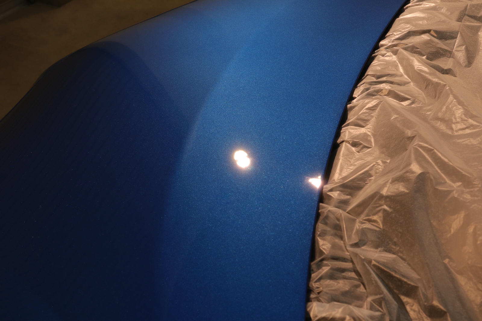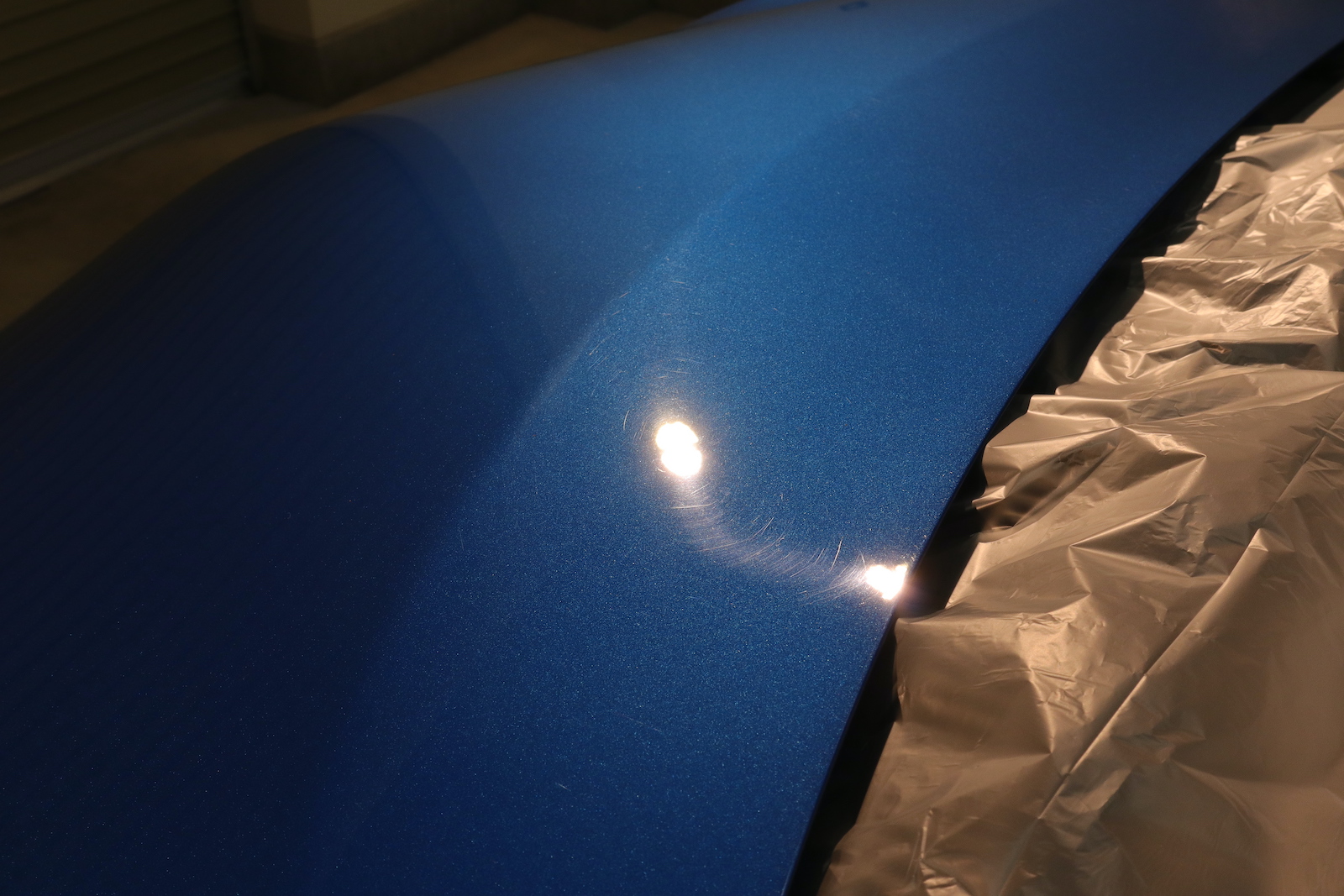 洗浄と全面ガラス撥水が終わり、研磨作業に移ってまいります。こちらはボンネットですが、販売前に研磨したのか磨きキズが付いています。正しく研磨できなければ、このように磨きキズが残ってしまいます。