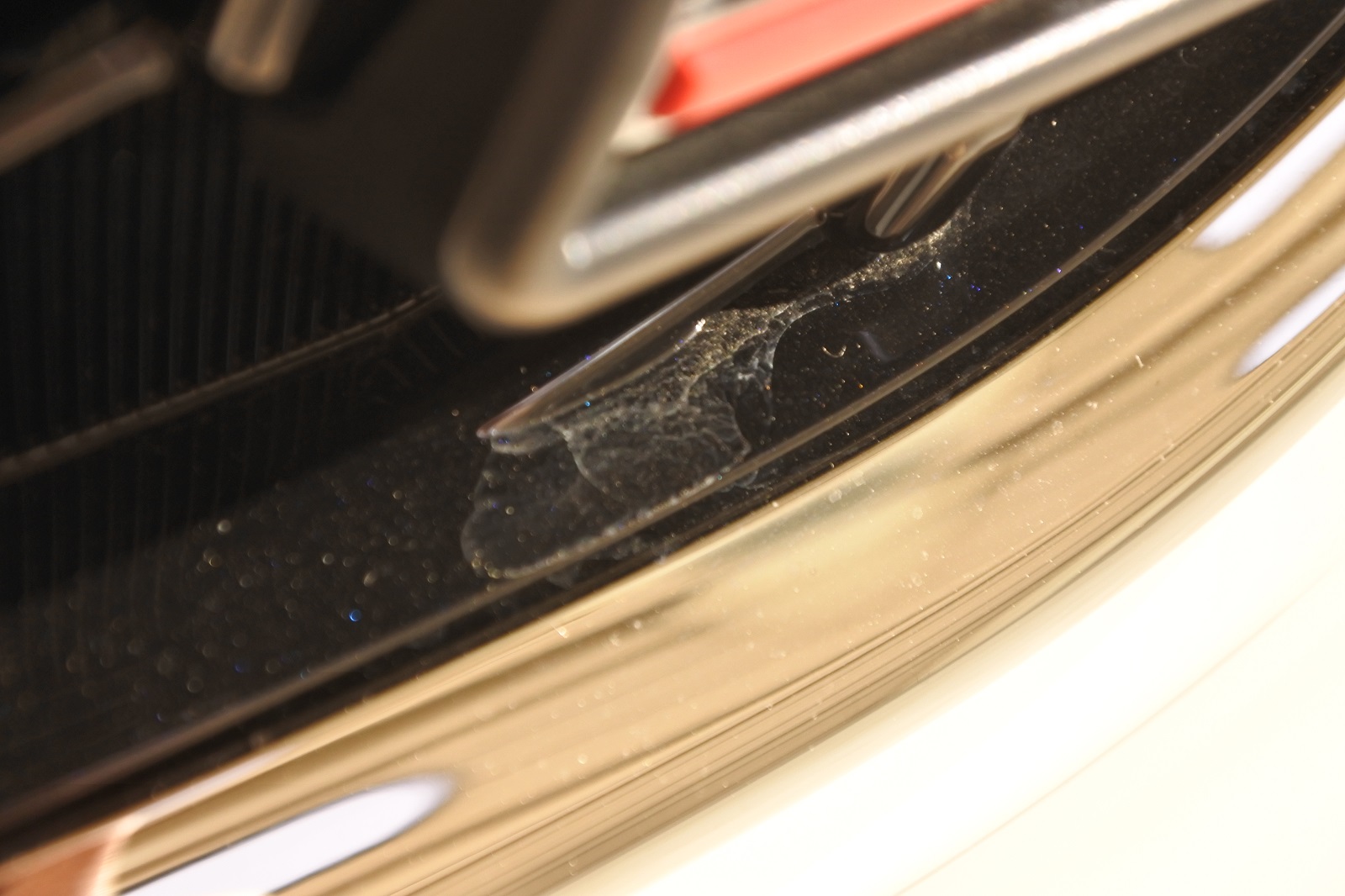 こちらは、リアバンパーのリフレクター下の部分です。新車でもこのような大きな水ジミも付いていますので、ウォータースポットリムーバーを使って除去してまいります。洗浄前。