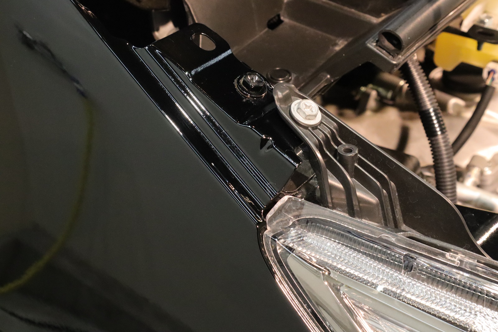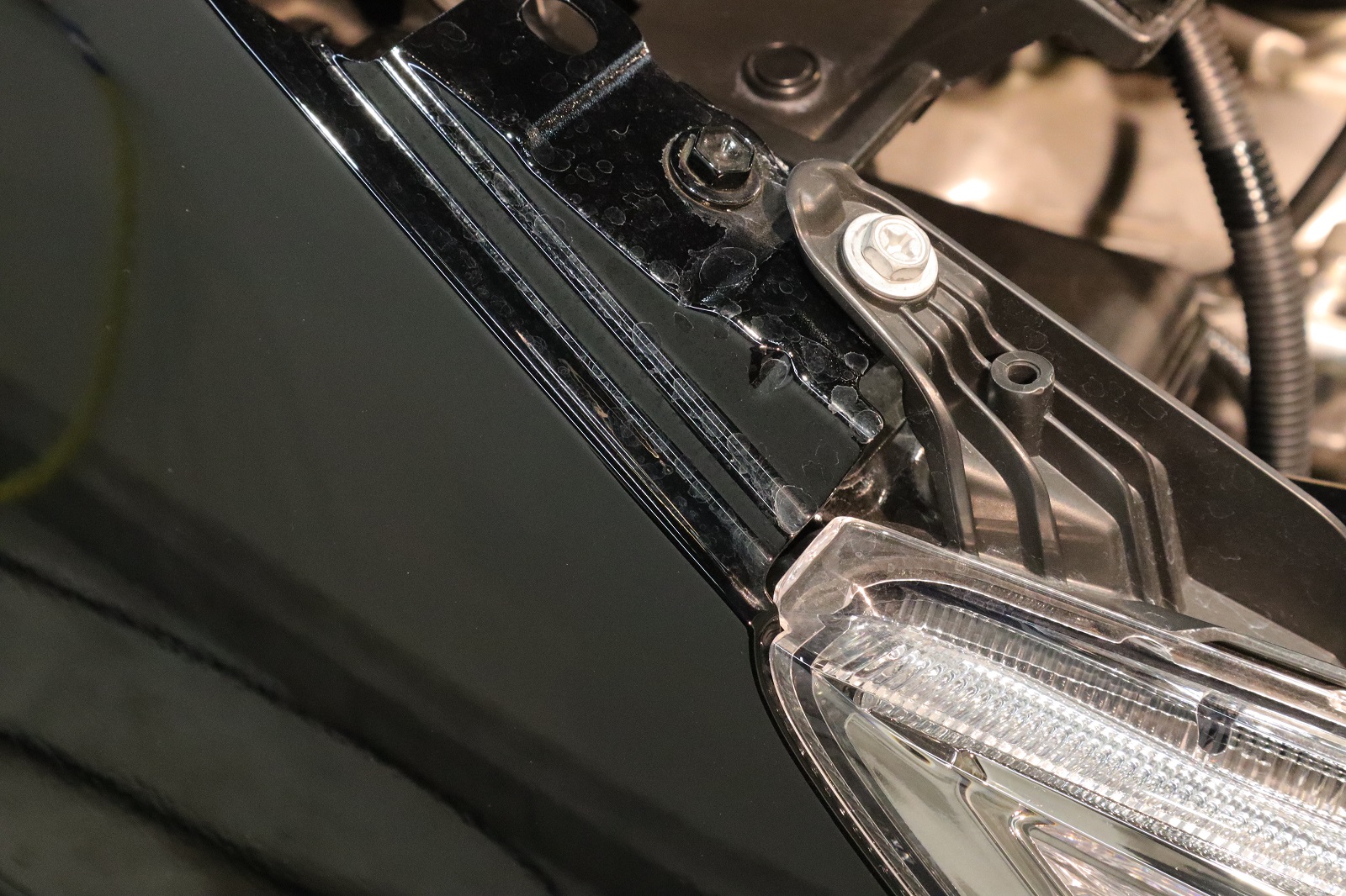 ヘッドライト上部にはこのように水滴が溜まってしまい水ジミとなります。こちらをキレイにしてまいります。