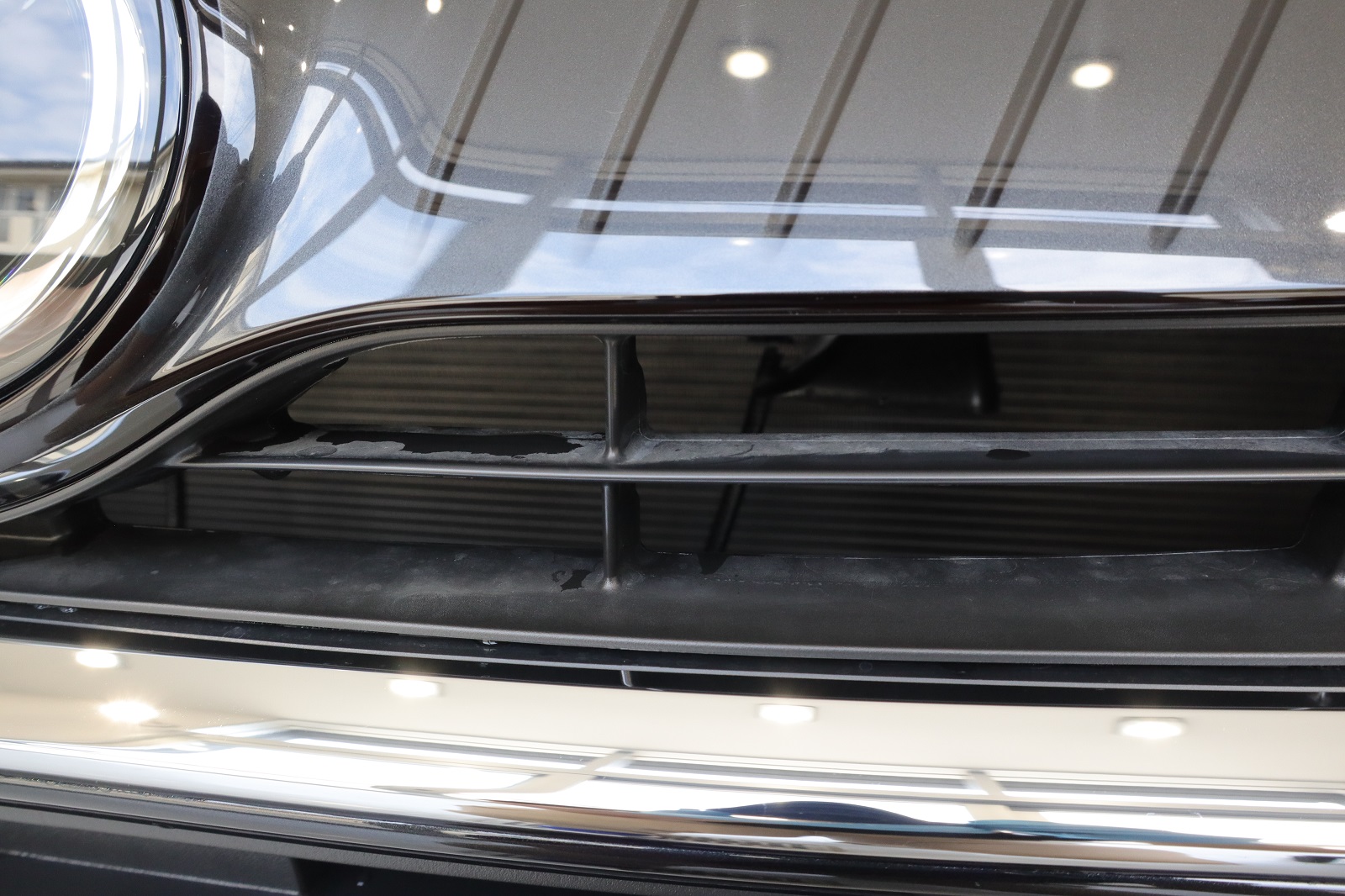 最初に洗車キズの原因になります砂埃や泥汚れをシャンプー洗車で落としてまいります。シャンプー洗車で落ち切らない汚れは汚れにあった洗剤を使い除去してまいります。こちらはフロントグリルに付着しておりました水ジミとなります。こちらをキレイにしてまいります。