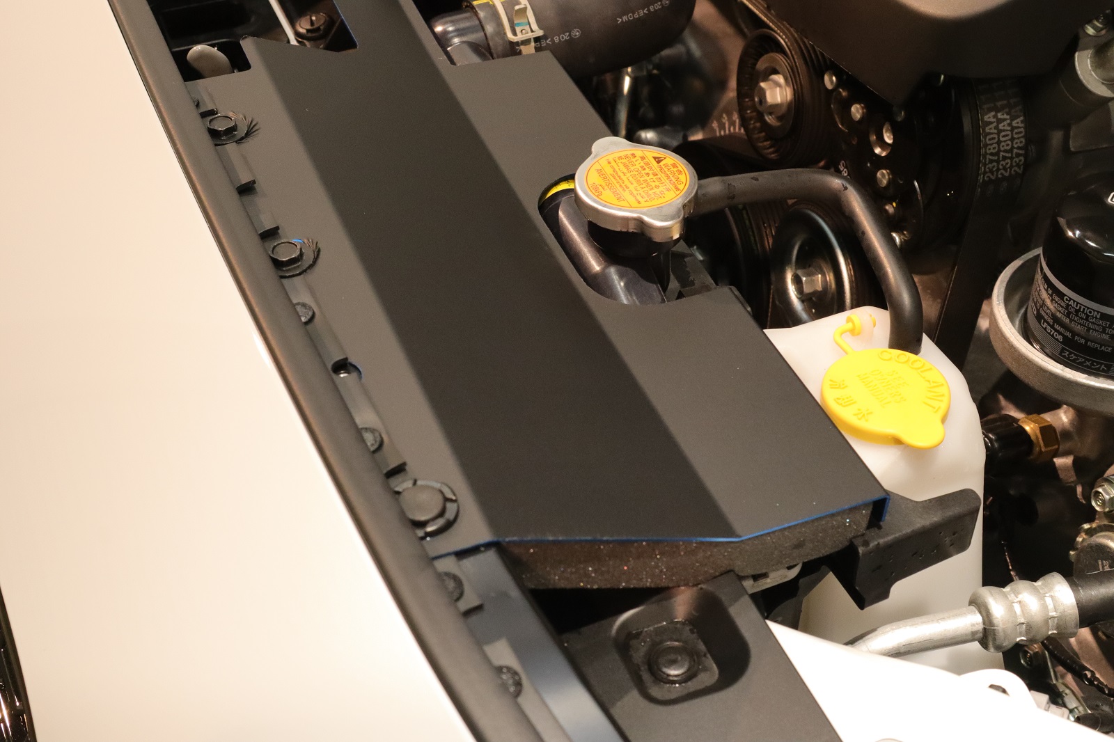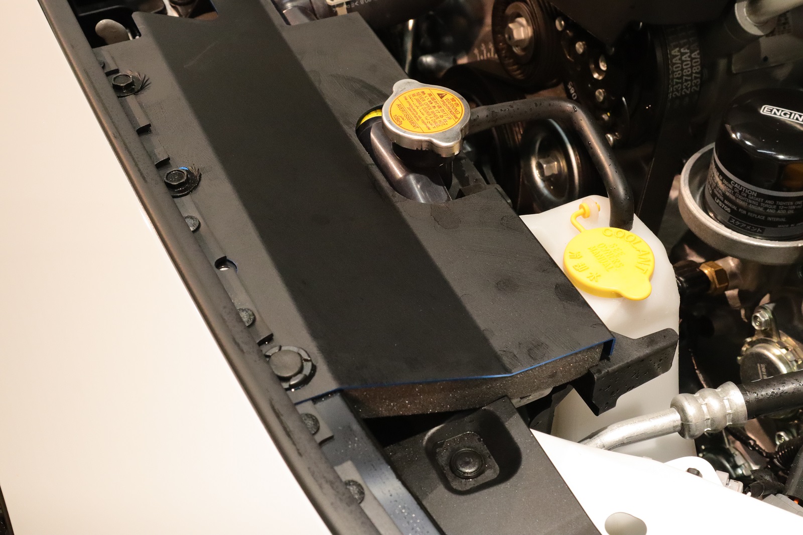 続いてボンネットの下部を洗浄してまいります。こちらにも水ジミが付着しておりましたのでキレイにしてまいります。