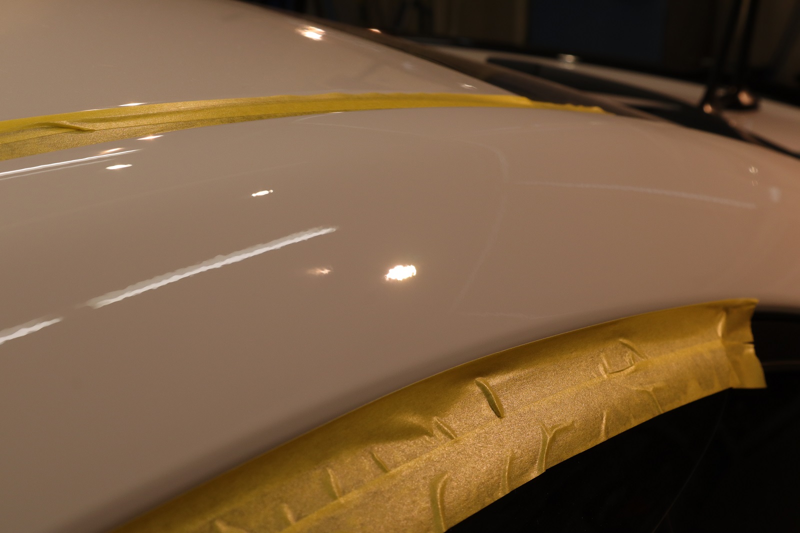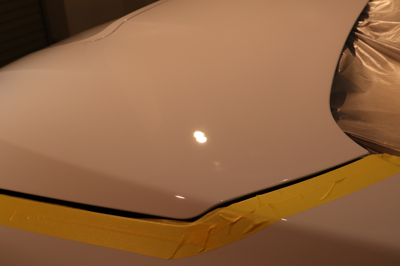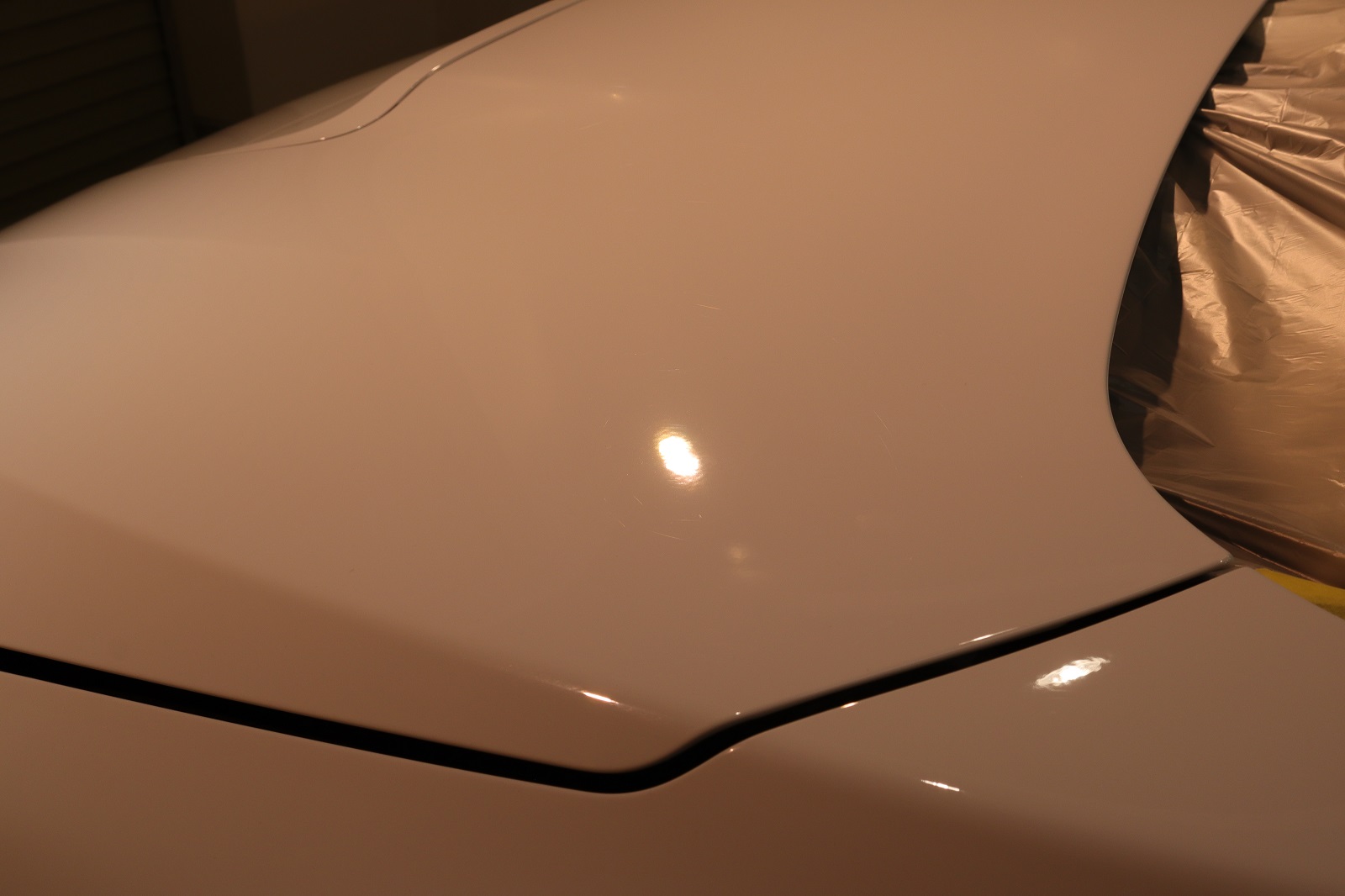 徹底的な洗浄が終わりまして研磨作業に移ってまいります。ボンネットの状態です。洗車キズがうっすら写っているのがわかります。こちらを美しく磨き上げてまいります。