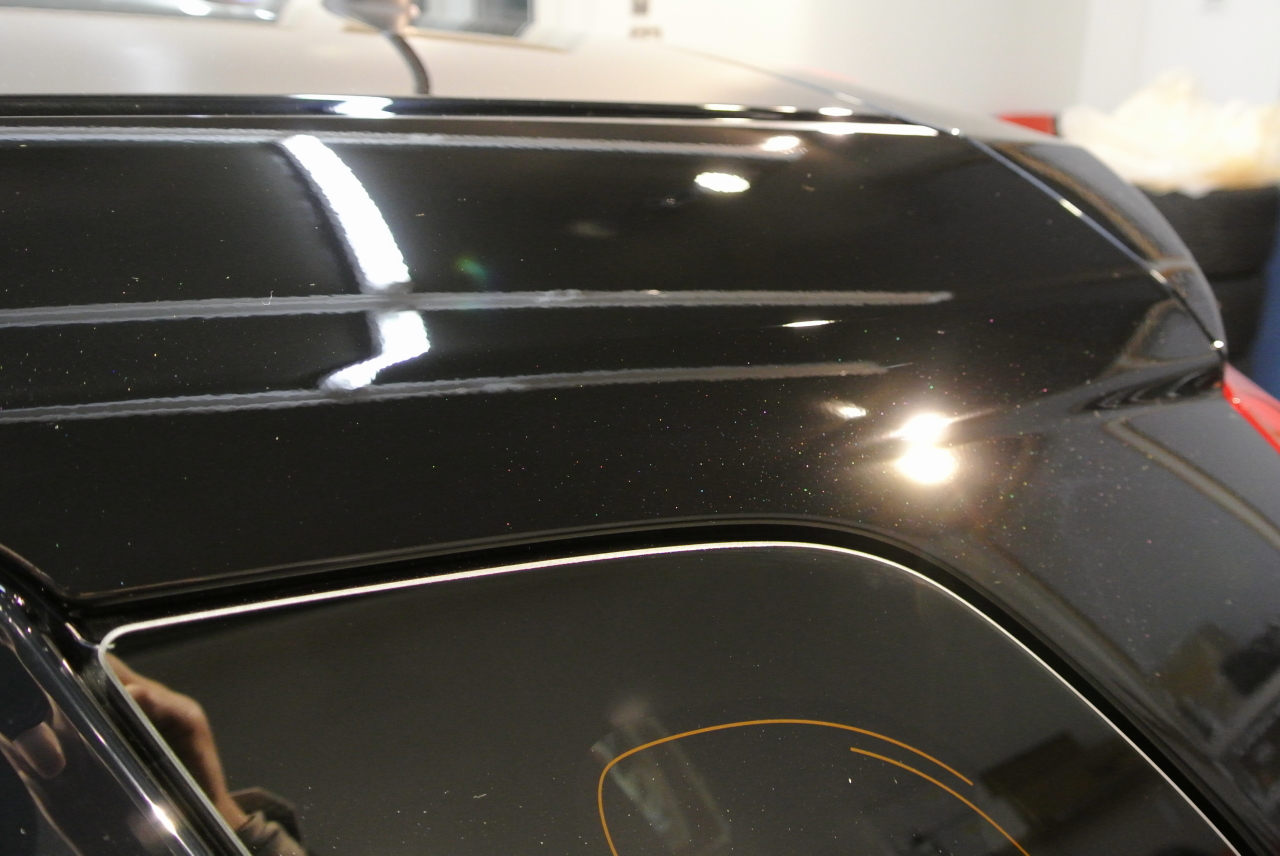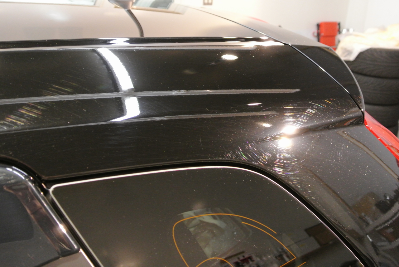 ボディーカラーは「クリスタルブラックパール」。登録してまだ1ヶ月、洗車もまだしていないという事でしたので、塗装面の状態は良いだろうと予想していました。しかし、実際には直線的で深い傷が多く見受けられました。スノーブラシでついた傷の様に見えますが、オーナー様には覚えが無いとの事です。何故ついてしまったのか。理由はわかりませんが、私共ができることは、オーナー様に喜んでいただけるよう、お車を美しく仕上げる事のみです。塗装に優しいマスタライズ研磨工法で傷を除去し、5層構造のTTクリア5レイヤーで、新車以上の濡れたような深い黒に仕上げて参ります!