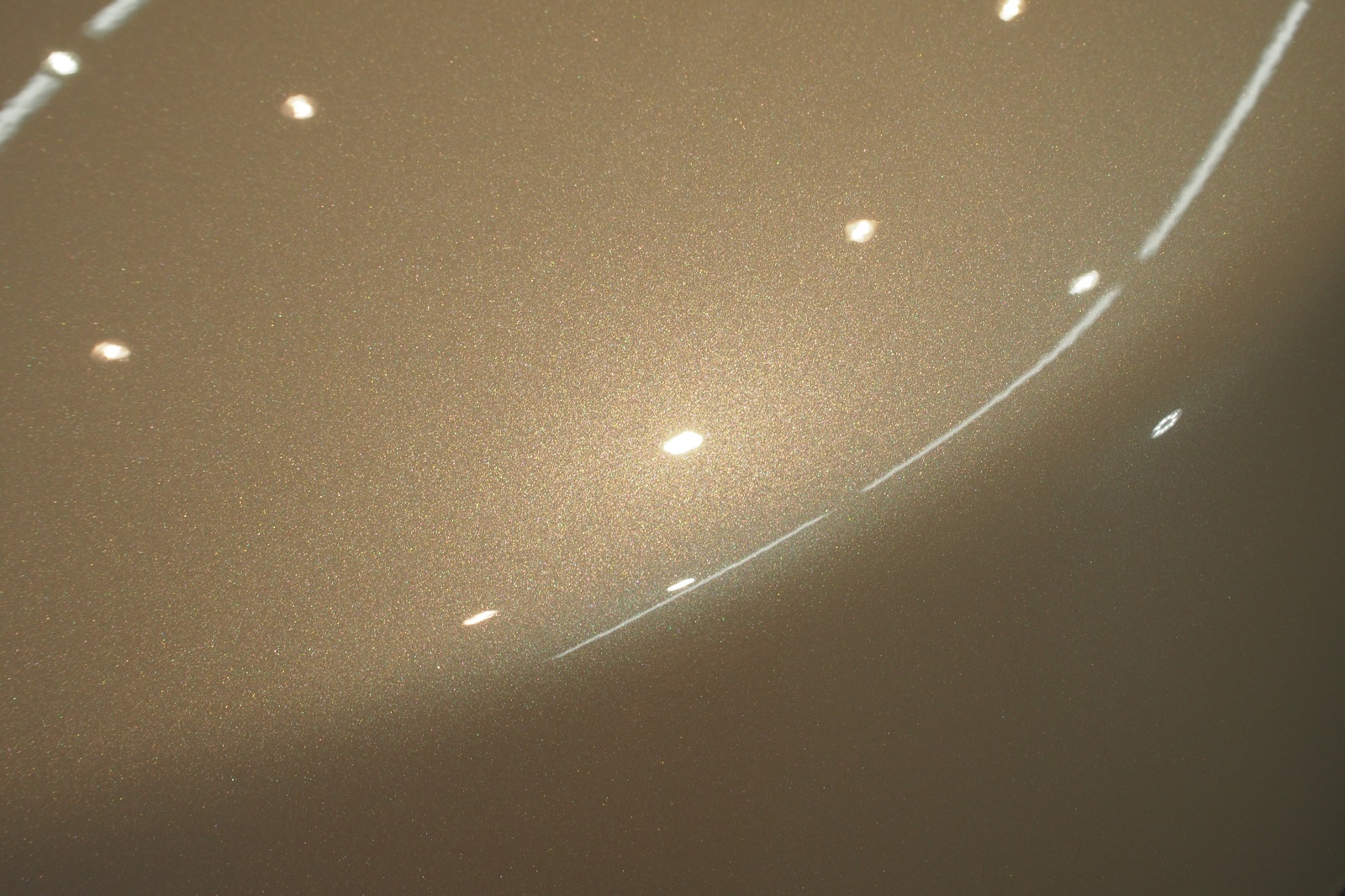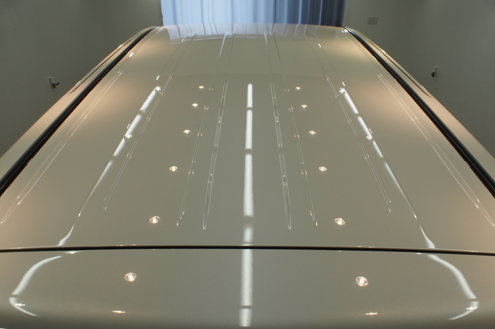 白いボディに照明がくっきり写り込むように研磨をかけ、グロスアーマーでコーティングを施工。