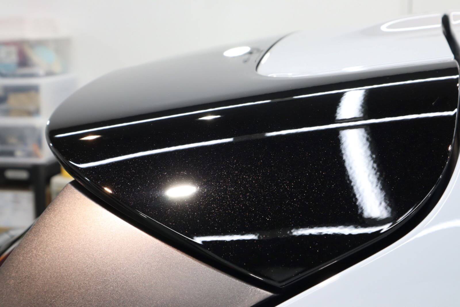 研磨後の写真が撮れてなく申し訳ございません。塗装面を美しく磨き上げる研磨作業も終わりましたので、グロスアーマーを施工してまいります。グロスアーマーは、3工程で強い被膜になりますので、塗装面を汚れや劣化から守ってくれます。それから、透明度の高い被膜ですので、美しく磨き上がった塗装面の邪魔をすることなく、美しさを最大限に引き立てます。