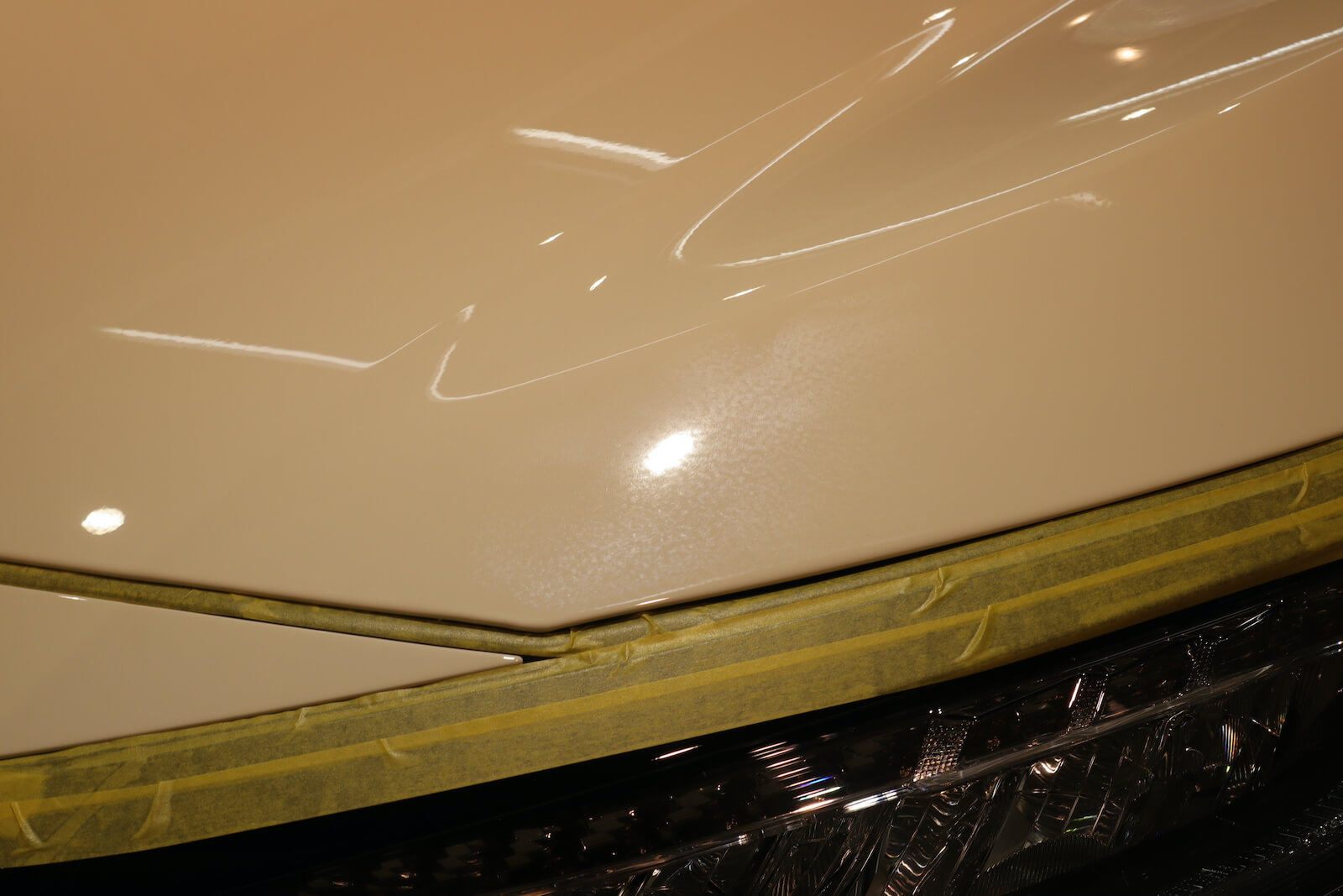 徹底的な洗浄が終わり、研磨作業へ移ってまいります。ボンネットに異物の除去をしようとしたのかペーパーで擦られた跡が残っておりました。このような跡がある状態でコーティングはできませんので、しっかり磨き上げてまいります。