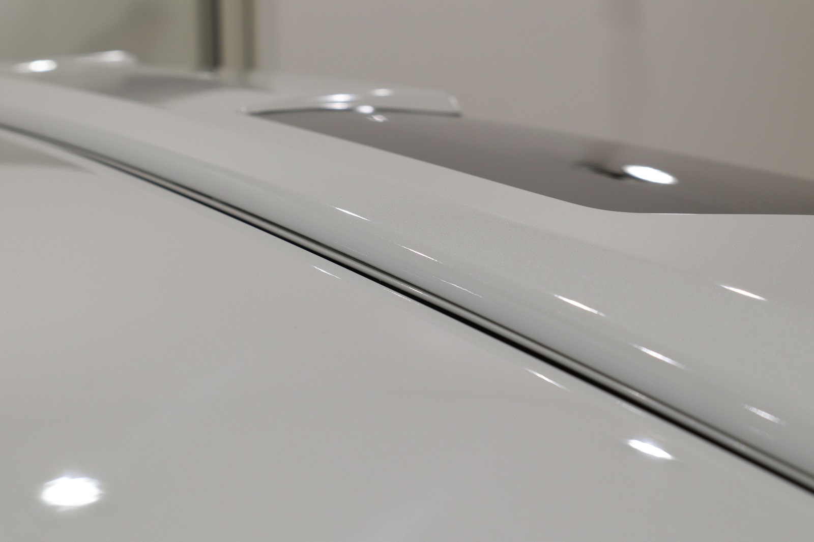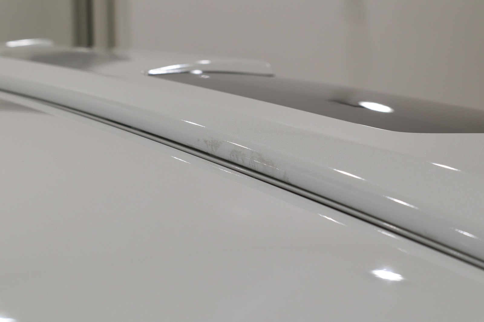 最初に洗車キズの原因になります砂埃や泥汚れをシャンプー洗車で落としてまいります。シャンプー洗車で落としきれない汚れは汚れにあった洗剤を使い除去してまいります。こちらはルーフについているスポイラーの隙間に保護フィルムを剥がした際についたと思われる糊跡が付着しておりました。キレイにしてまいります。
