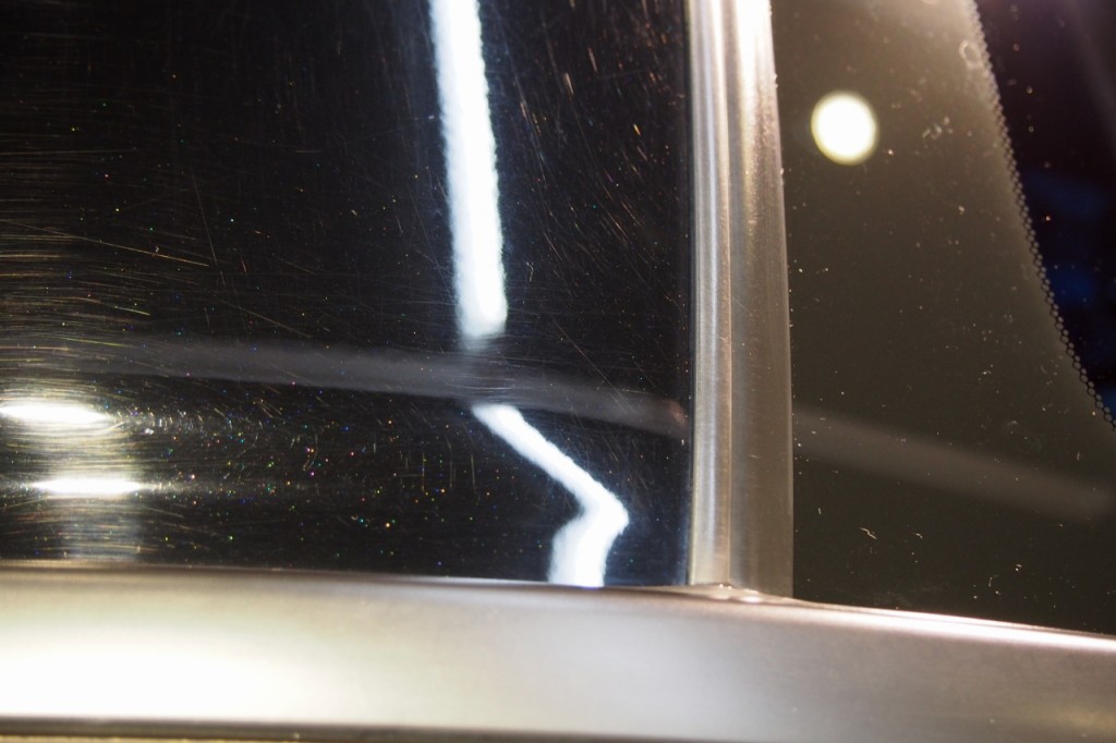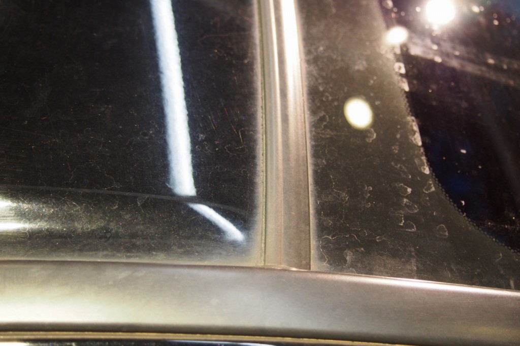 フロントガラス上部のモール付近。洗車機ワックスでしょうか?モールの縁に頑固な汚れとなり堆積して固着しています。水ジミも確認できますね。