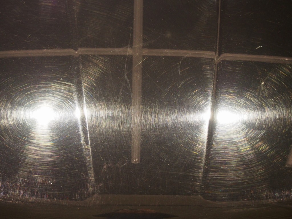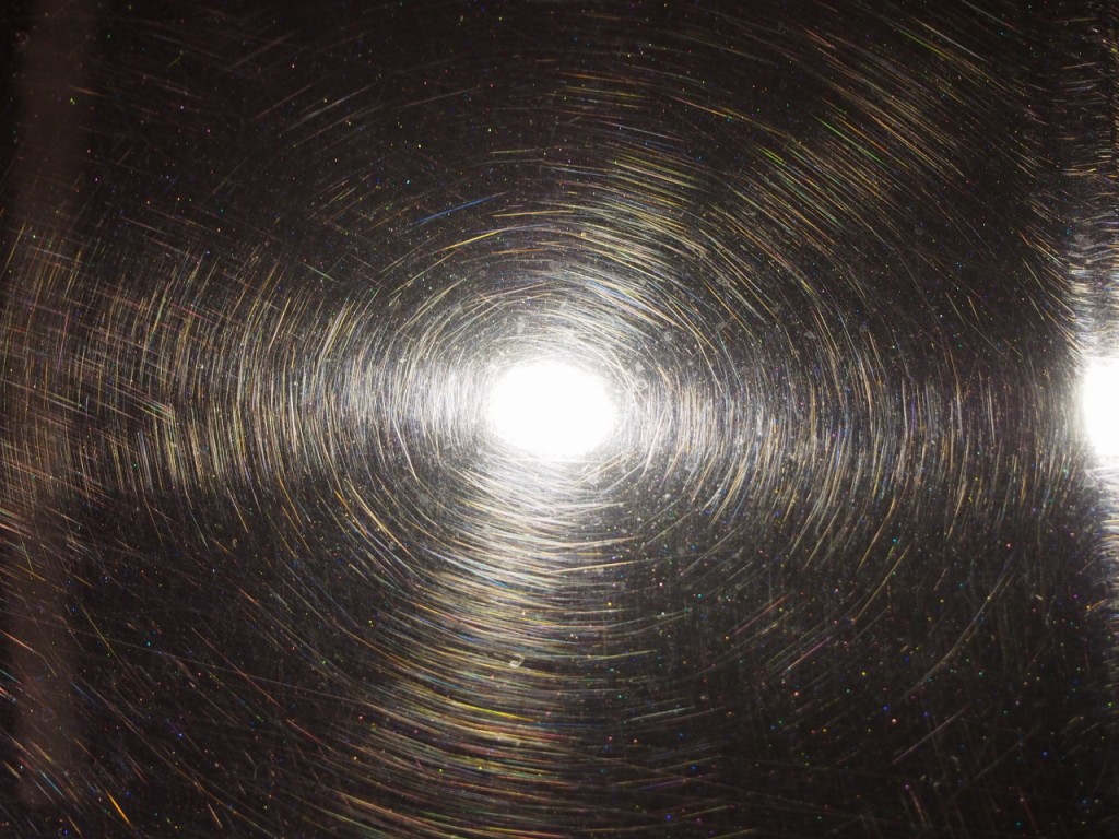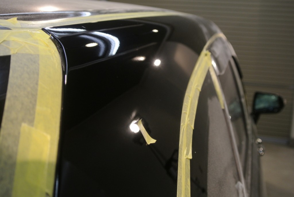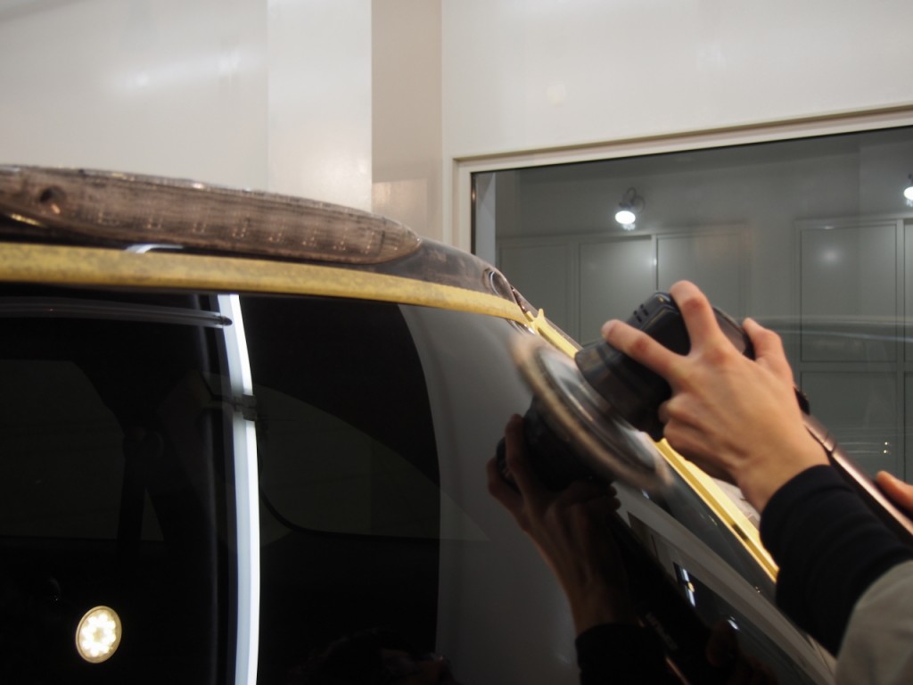 研磨でここまで仕上げていきます。特殊な研磨方法を用いておりますので、通常のシングルポリッシャーで磨いた時のような、バフ目、オーロラ傷は発生しません。当店は、さらに外光を遮断し、特殊な照明を当て、通常見えないような微細な研磨傷まで確認いたします。コンパウンド(研磨剤)に含まれる潤滑成分が微細な研磨傷を隠してしまう事もありますので、そのような成分を極限まで減らした特殊なコンパウンドを使用し、可能な限り精密な研磨を心がけております。大変時間と手間がかかりますが、塗装本来の美しさを引き出したいという思いから、このような作業工程をとっております。