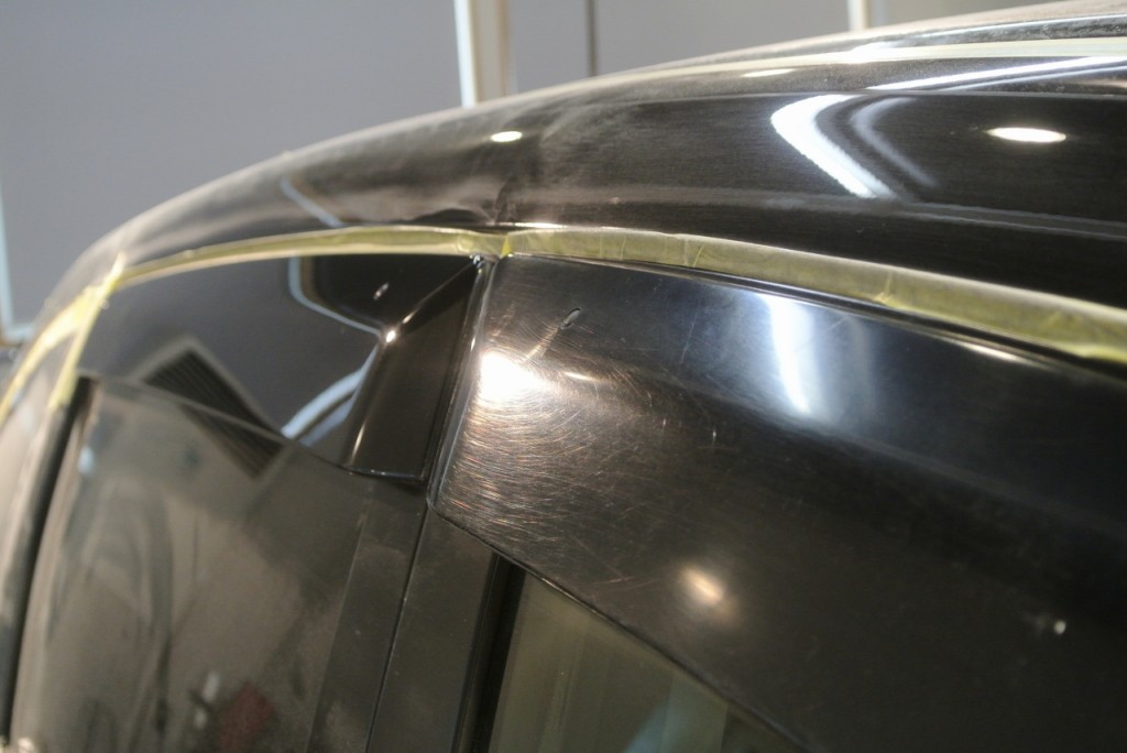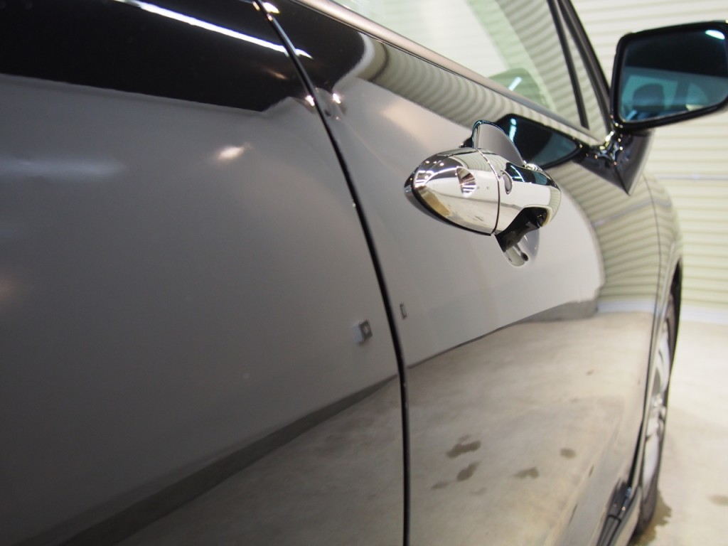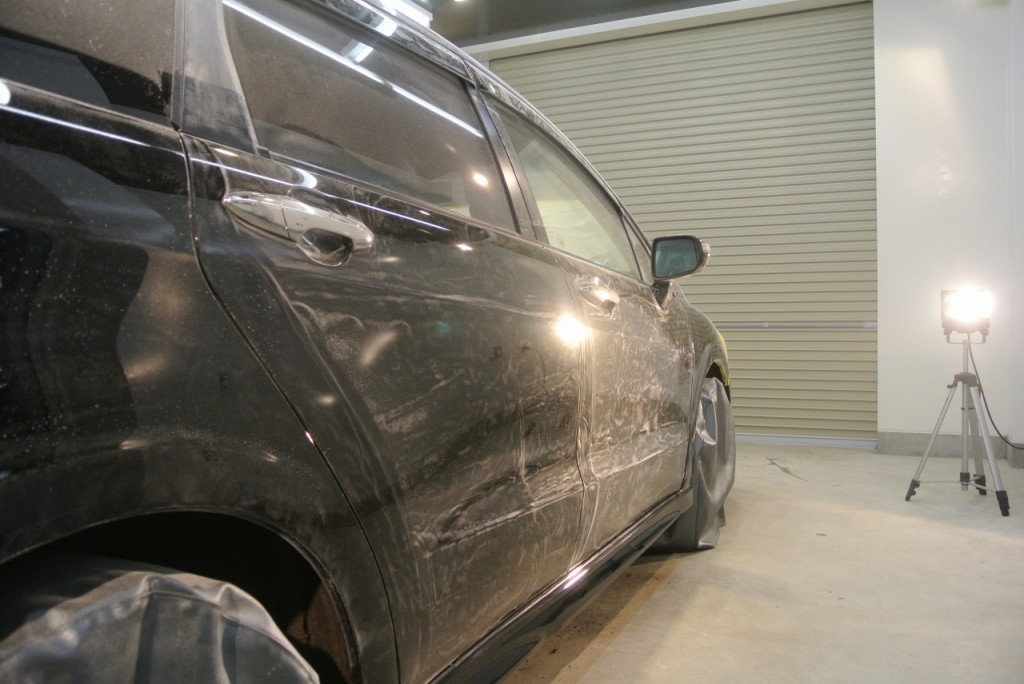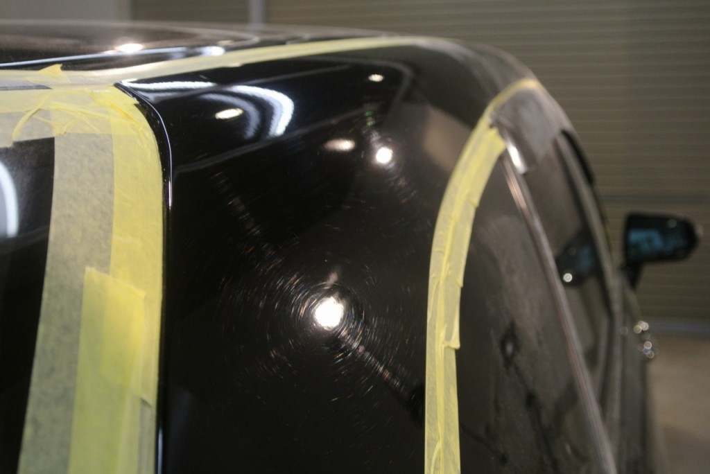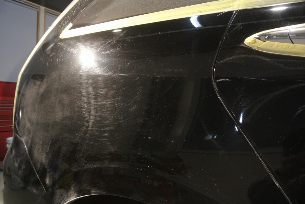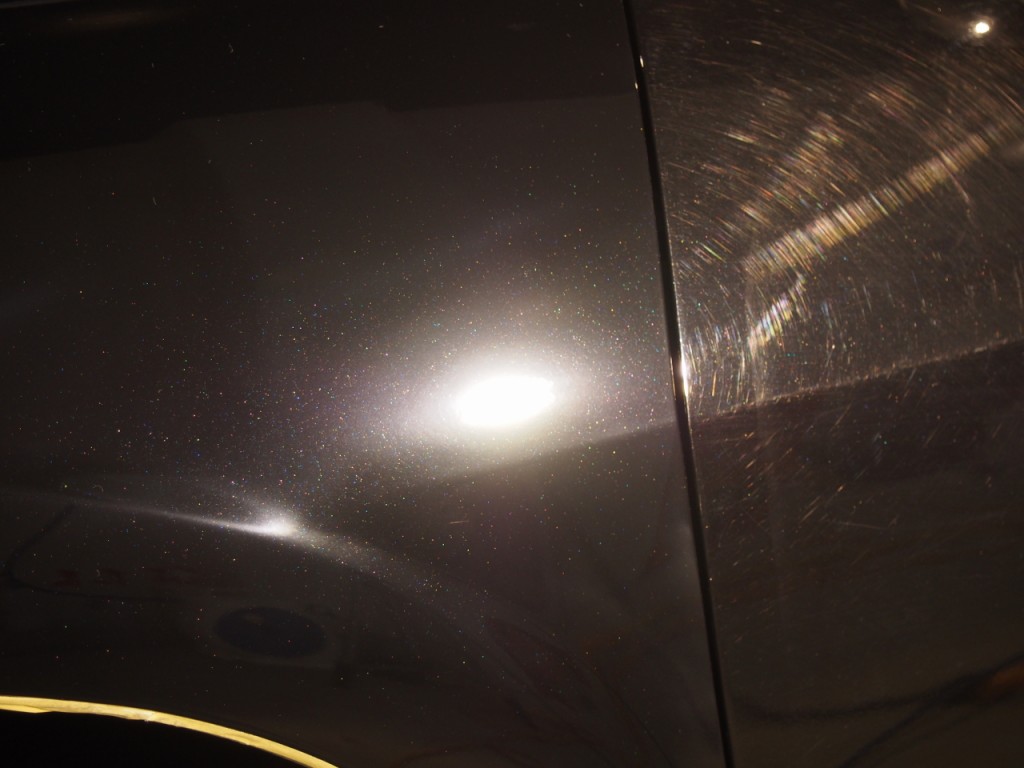 左リヤドア研磨中。照明の左側は傷が消えています。この写真では綺麗に見えますが、まだ微細な研磨傷がついています。この後さらに2工程を加え、微細な磨き傷を消していきます。