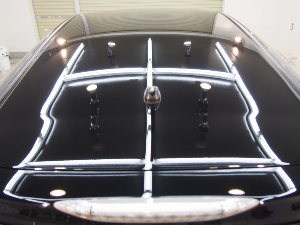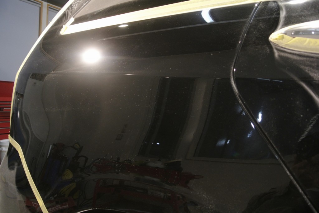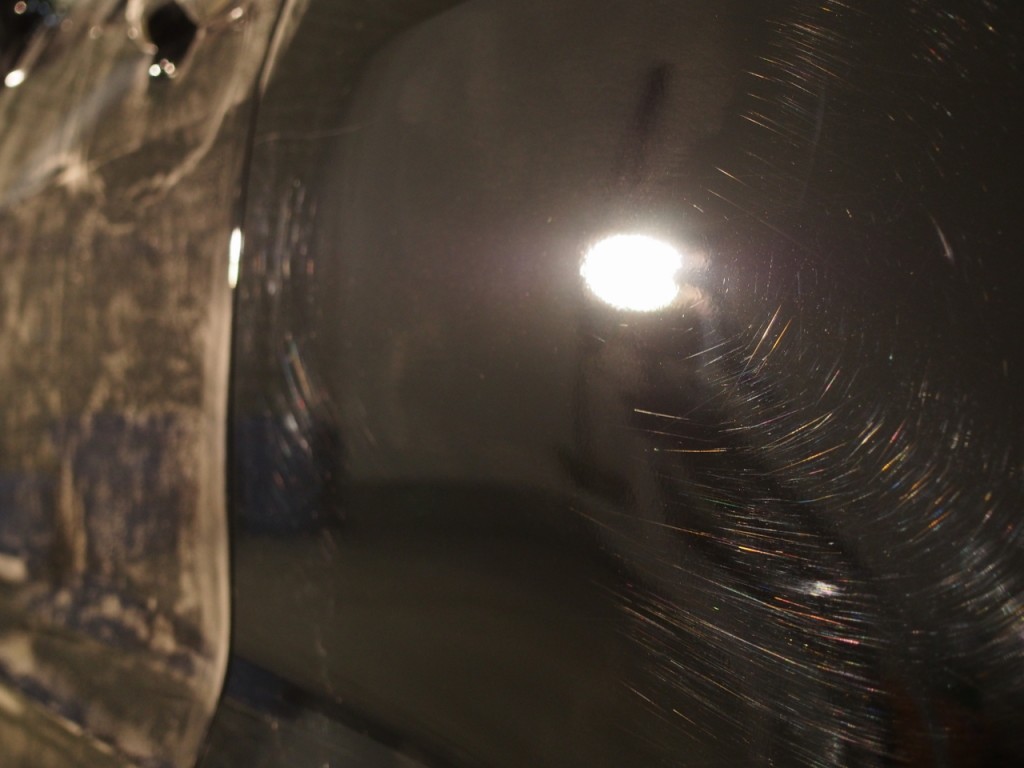 左側に見える左フロントフェンダーのみ研磨完了です。肉眼ですとしっかり黒く見えるのですが、特殊照明を当てて写真を撮るとちょっと白く写るんです。これは微細な磨き目の影響です。研磨というのは、粒子で削る作業ですので、どこまでいっても微細な磨き目は入るのです。それが肉眼で確認できる大きさか、できないかの違いなのです。当店は環境にこだわり、通常は見えないような微細な磨き目まで全てを確認した上で、コストパフォーマンスも考慮に入れ、現実的にご提供できる最良の仕上がりを目指し作業をいたしております。