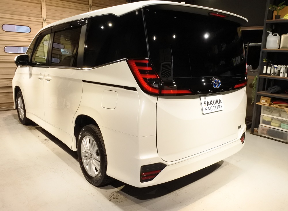 青森・弘前です。【トヨタ ノア 極艶ビューティフルコート+フロント・リアガラス撥水】のご用命でご入庫いただきました。当店初の新型ノア!ご用命くださったのは男性のオーナー様。以前当店で別のおクルマも極艶ビューティフルコートを施工してくださいました。今回もオーナー様のご期待にお応えできますよう、ディティーラーの佐藤が心を込めて施工させていただきます。