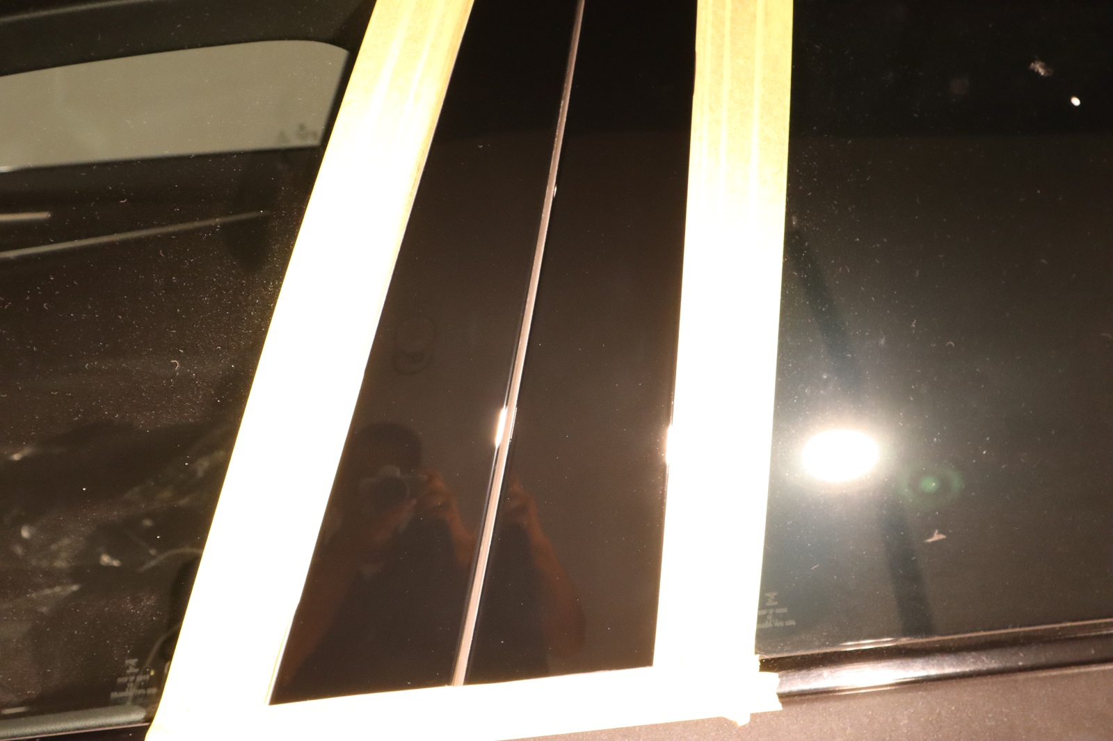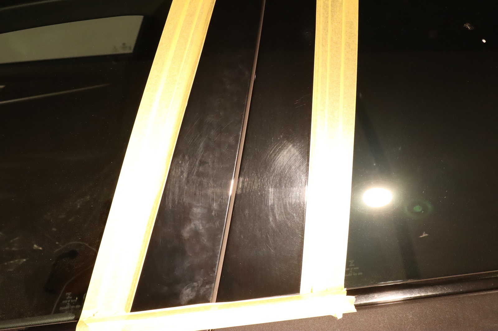センターピラーのピアノブラックにもコーティングの劣化と思われるシミ、洗車キズがございましたのでこちらも美しく磨き上げてまいります。