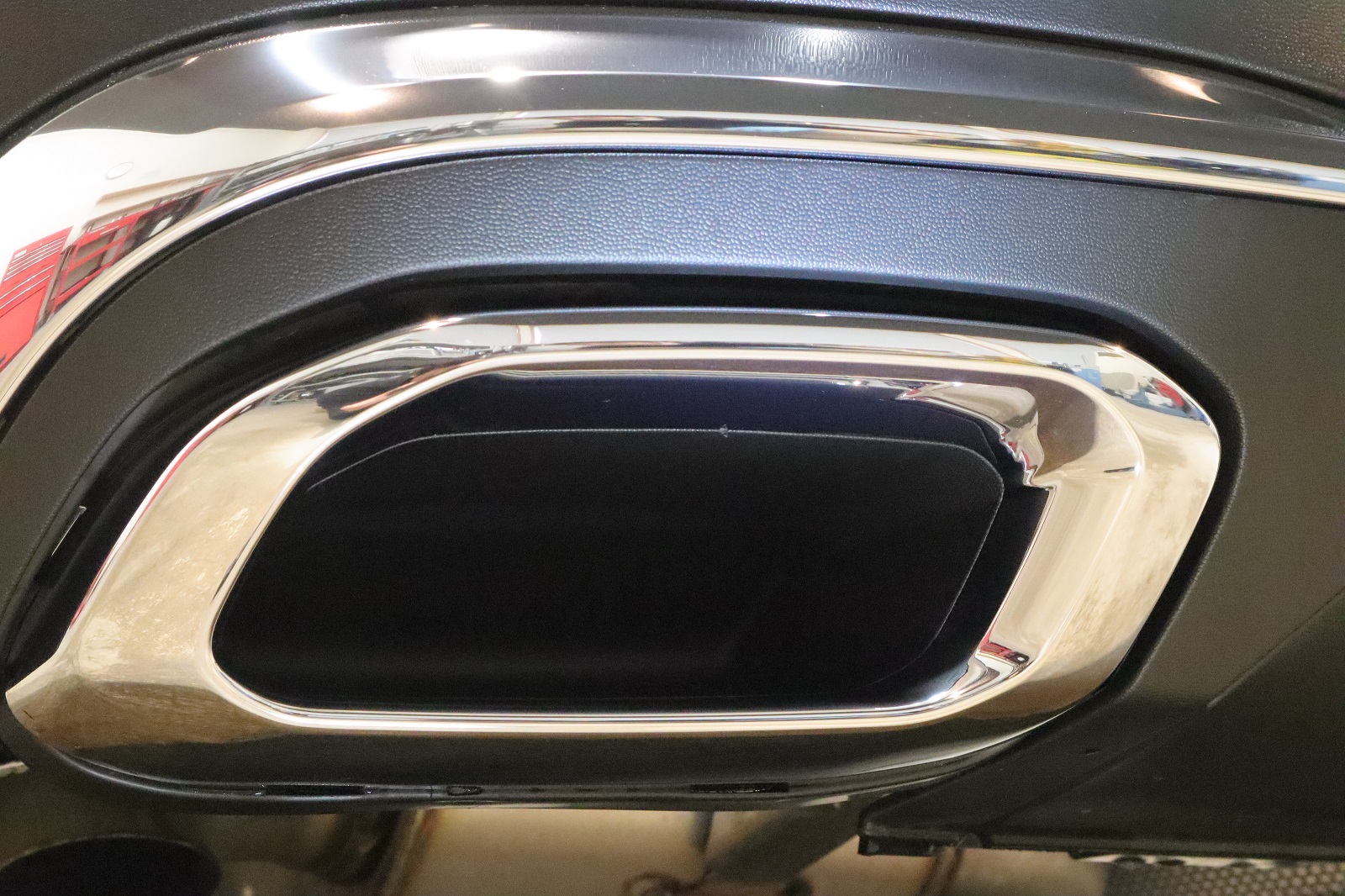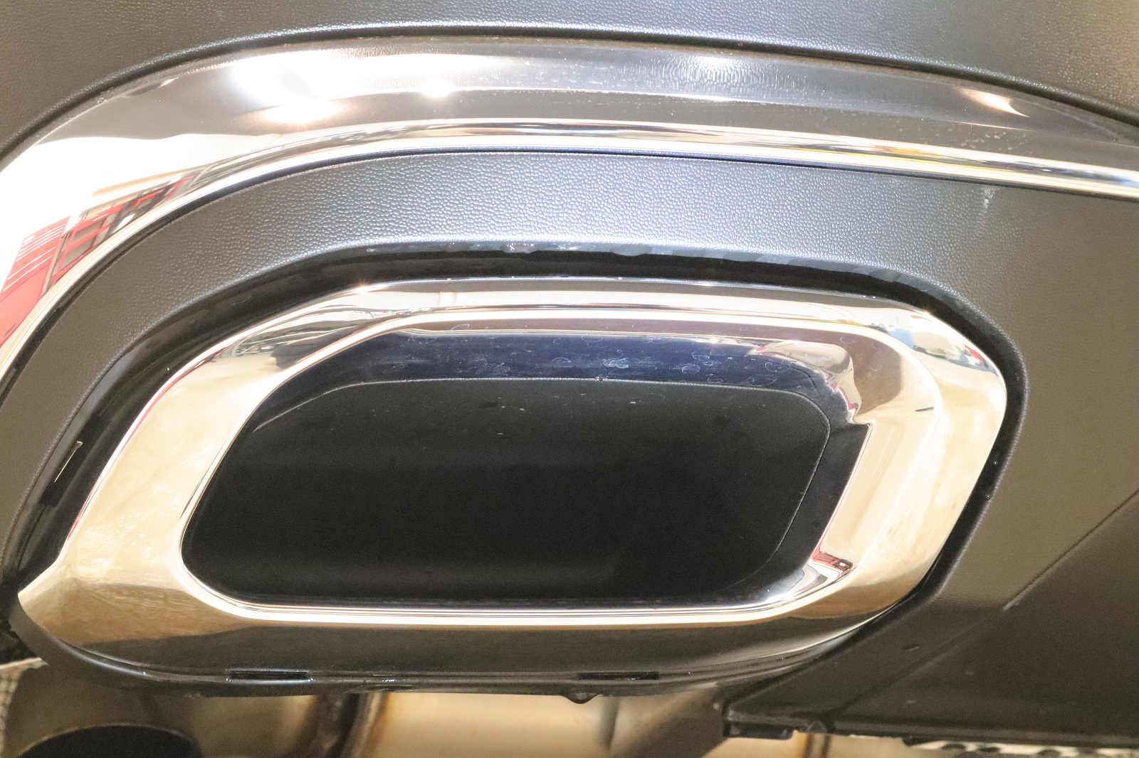 塗装面の洗浄が終わりましたので、細部洗浄に移ってまいります。マフラーの内側に水ジミが付着しております。水ジミを除去できます洗剤を使いしっかり除去いたします。