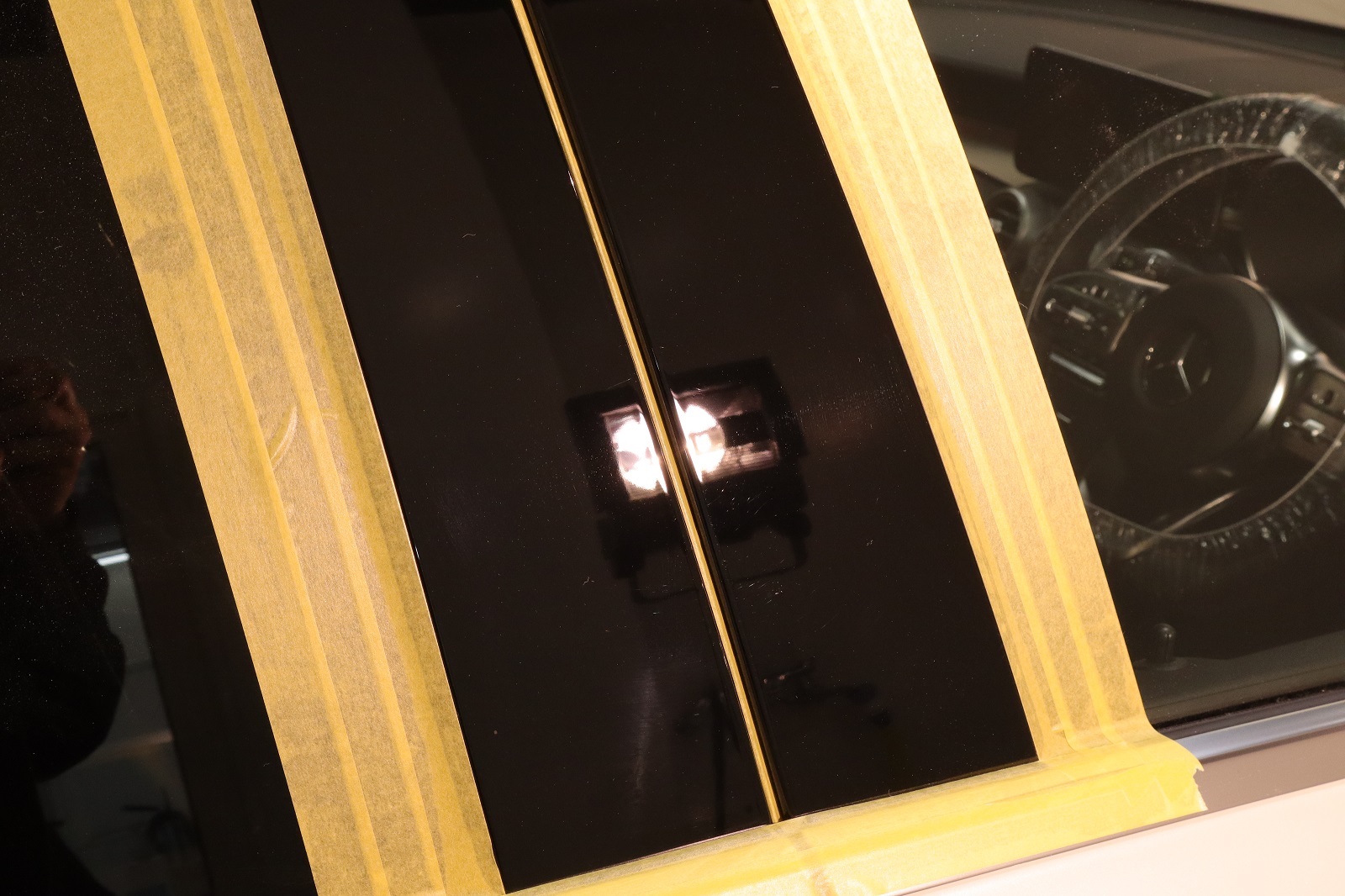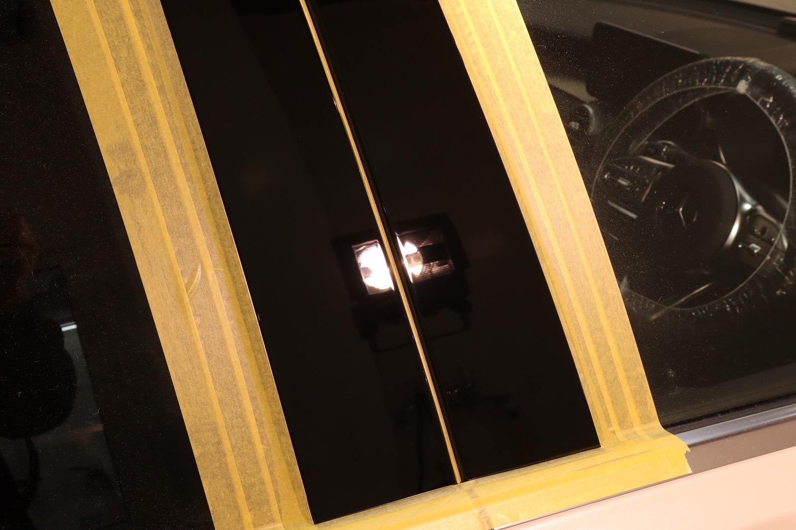 磨くことが難しいとされるピアノブラックのピラーを磨き上げてまいります。うっすらと細かい傷が付いておりましたので、美しく磨き上げてまいります。