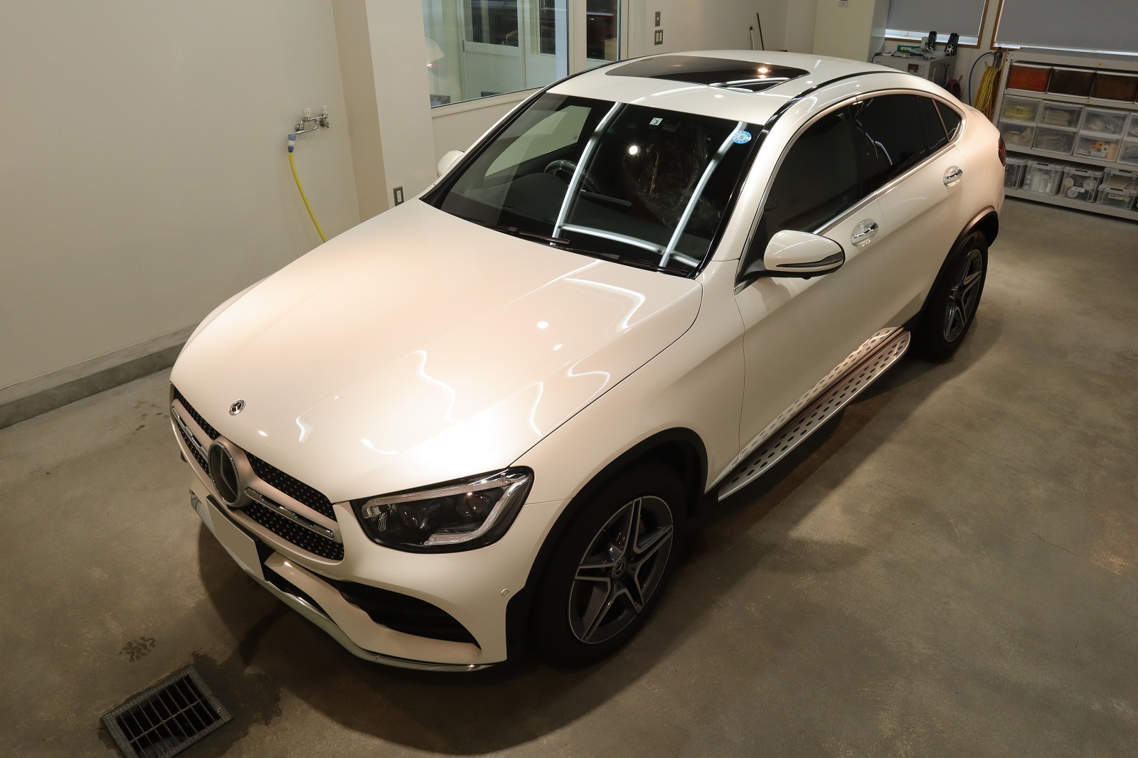 本店です。【ベンツ GLC 220d 軽研磨+グロスアーマー+全面ガラス撥水+金属メッキモールプロテクションフィルム】のご用命でご入庫いただきました。