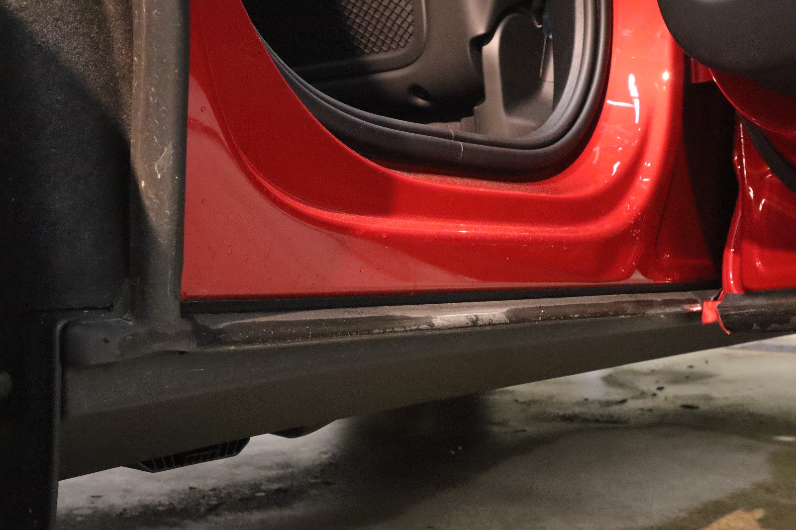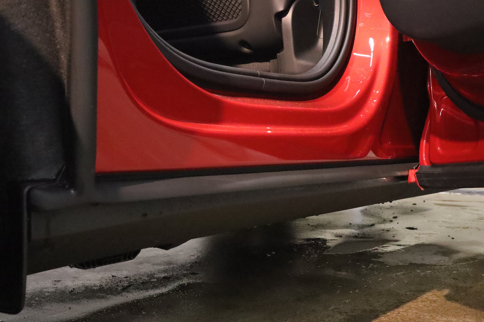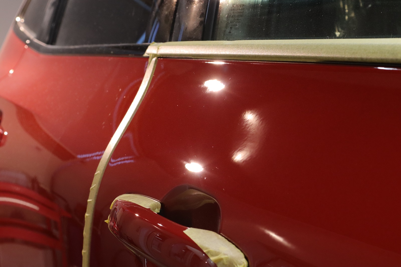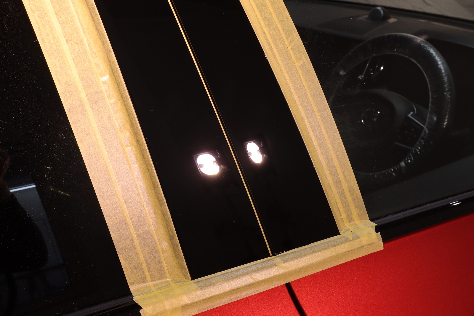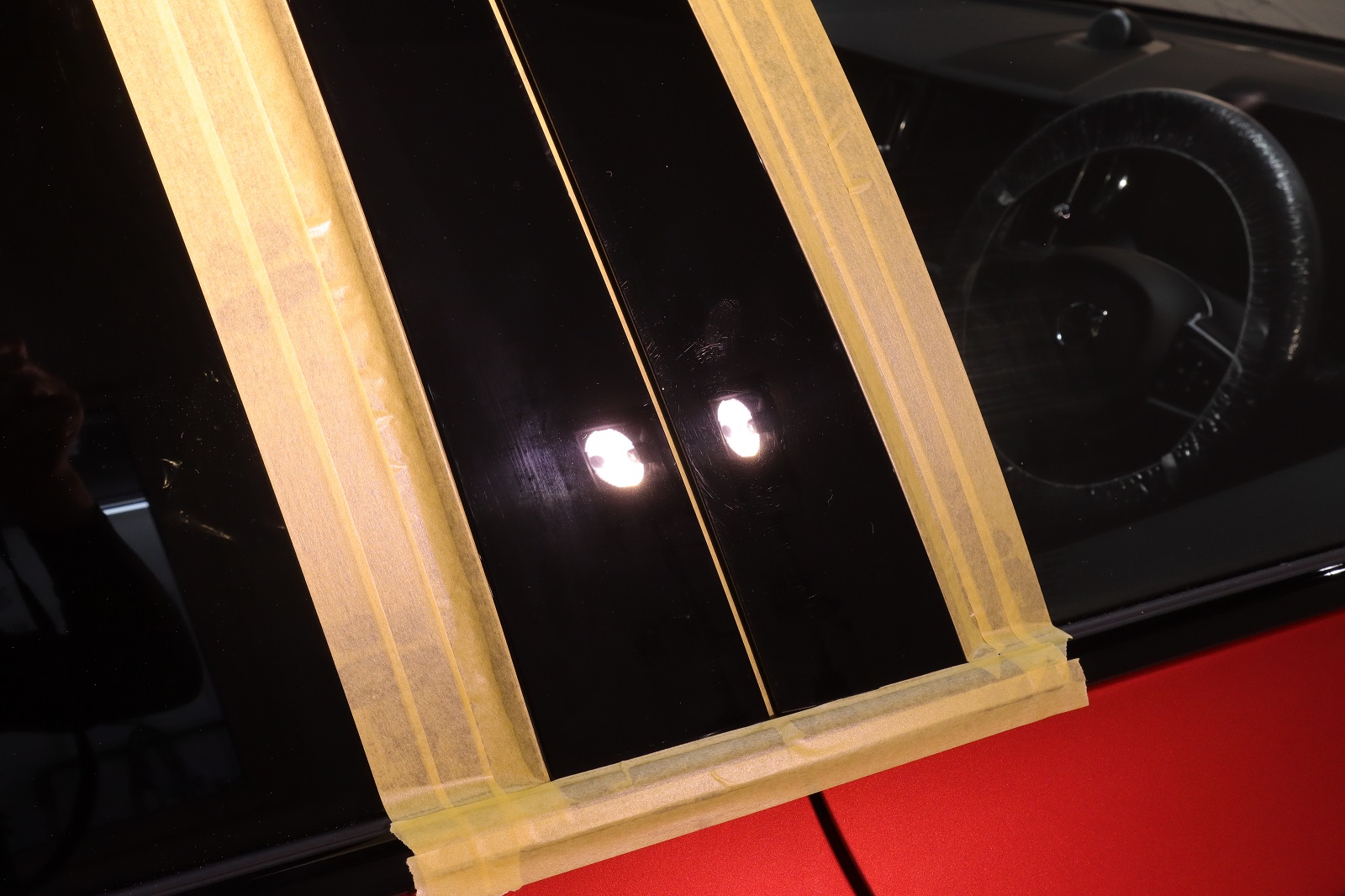 磨くことが難しいとされるピアノブラックのピラーを磨き上げてまいります。うっすらと細かい傷が付いておりましたので、美しく磨き上げてまいります。