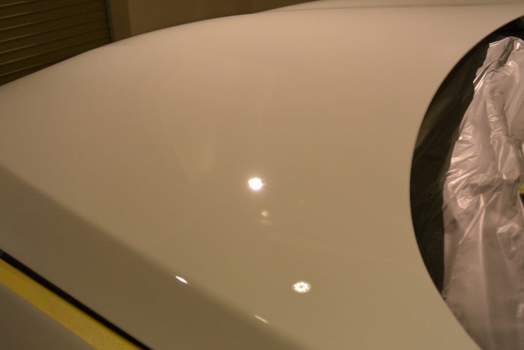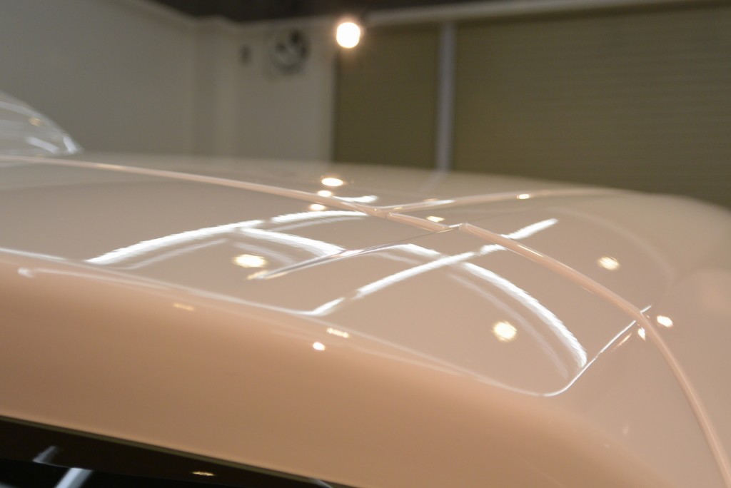 研磨作業が完了いたしまして、5層構造のTTクリア5レイヤーを施工して参ります。作業工程は非公開なので、ご紹介できないのですが、5層のコーティングを丁寧に重ねて参ります。ボディーカラーがアルピンホワイトのこちらのお車。ソリッドホワイトなのですが、TTクリアの特徴でもある濡れた様な光沢で、プルプルのたまご肌に仕上がりました!