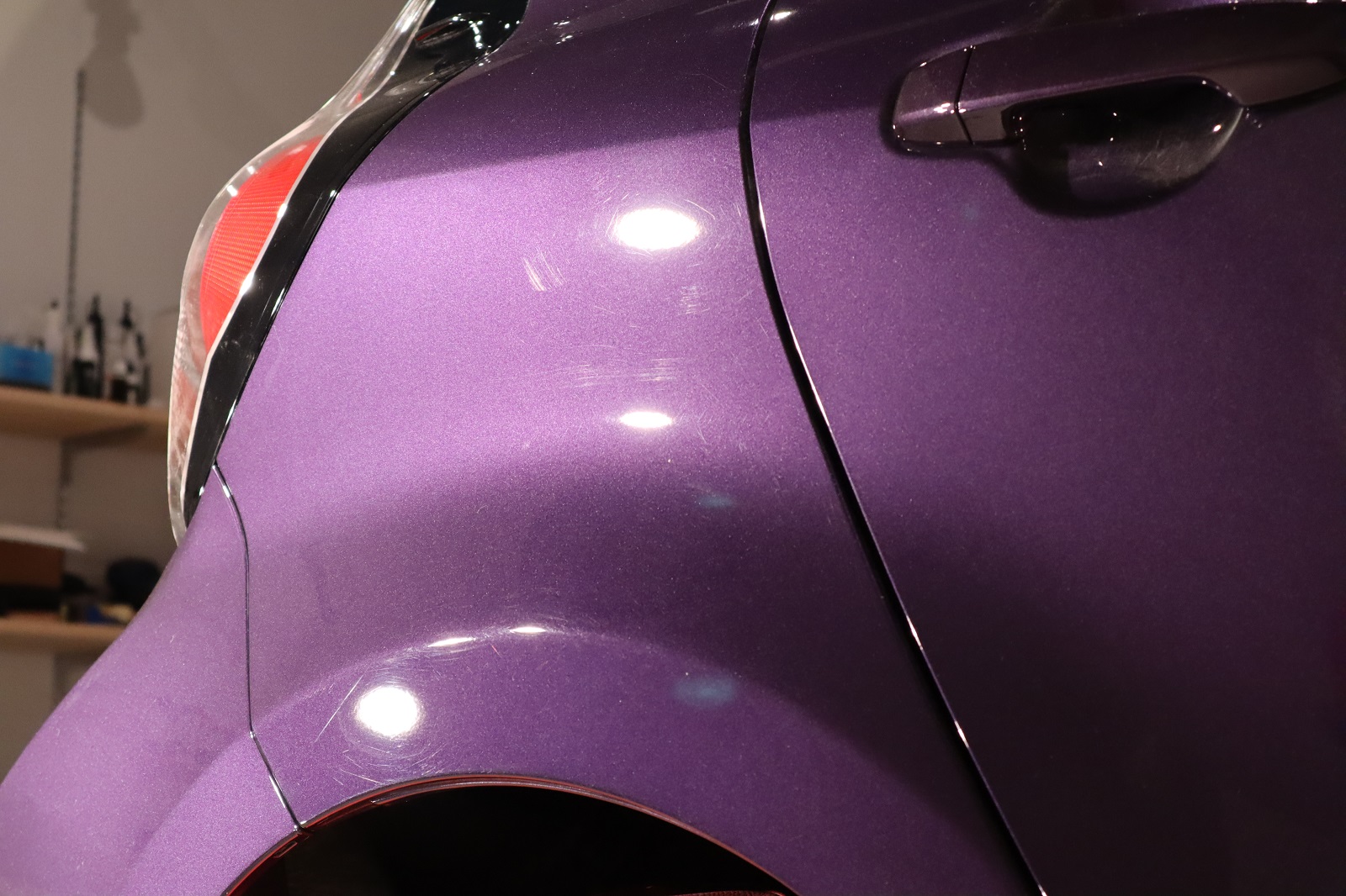 右リアフェンダーには洗車キズというより引掻きキズでしょうか、少し深いキズが入っておりました。こちらも美しく磨き上げてまいります。