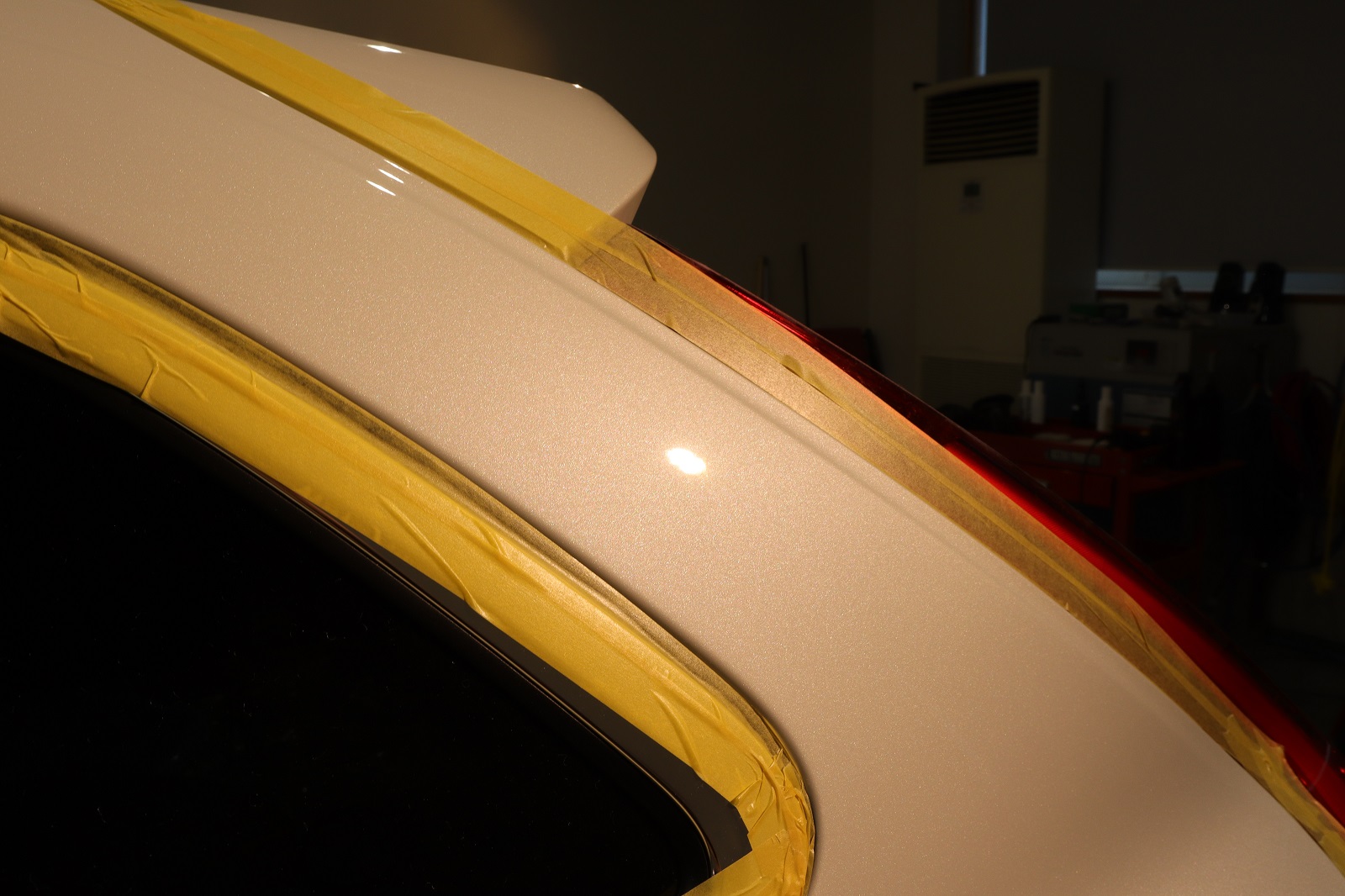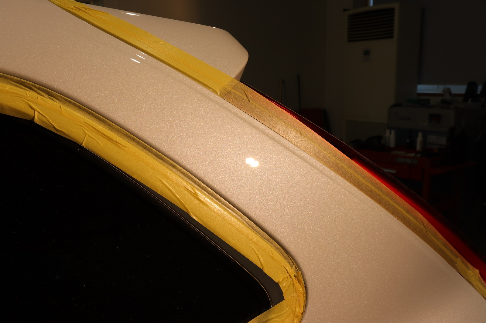 全ての施工が終わり、3工程で強い被膜になりますグロスアーマーを施工してまいります。グロスアーマーは、透明度の高い被膜ですので美しく磨き上げられた塗装面の邪魔をすることなく、美しさを最大限にいたします。また、強い被膜で塗装面を汚れや劣化から守ってくれます。