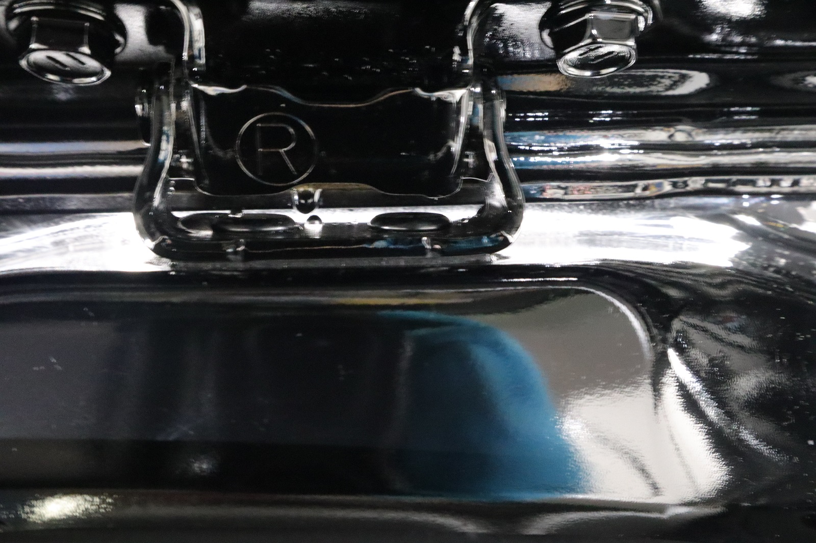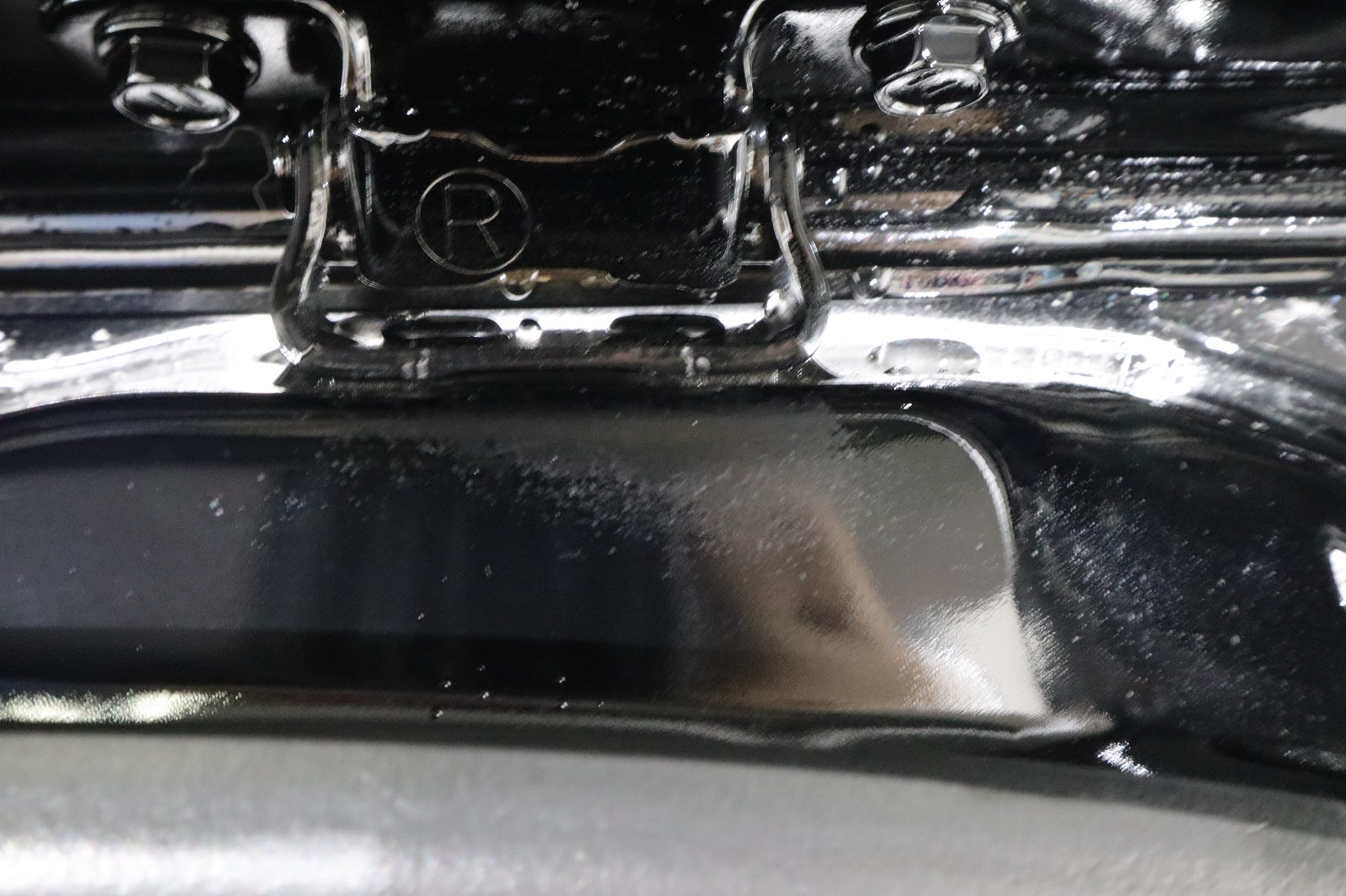 リヤゲートヒンジ部のグリス垂れです。新車ですのでゴミや汚れ等は付着していませんが、このまま放っておくと砂やホコリなどが付着し汚れが蓄積されていきます。なので汚れる前にキレイに除去します。