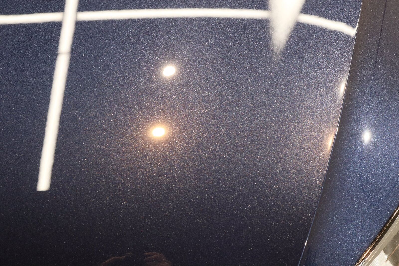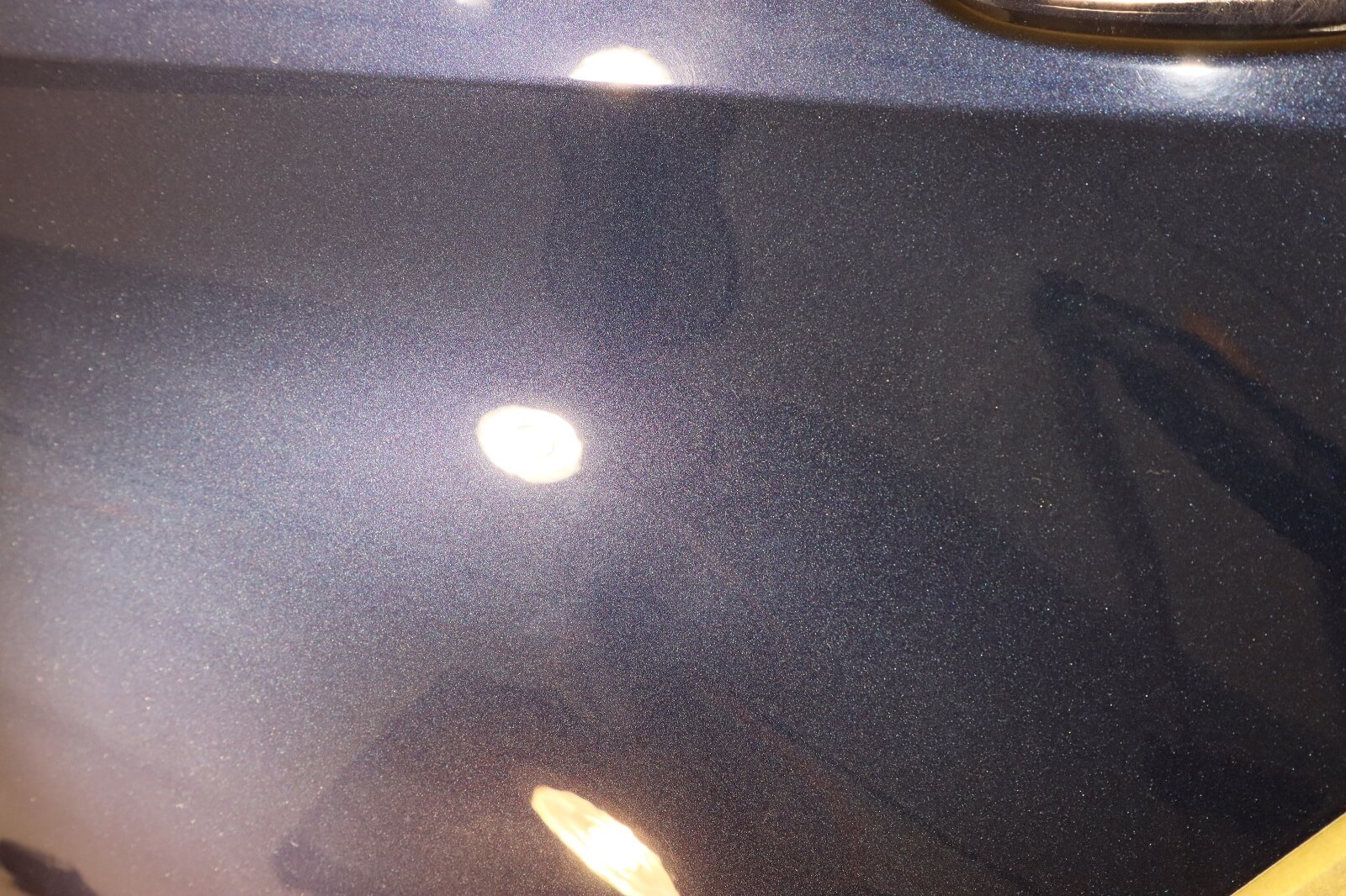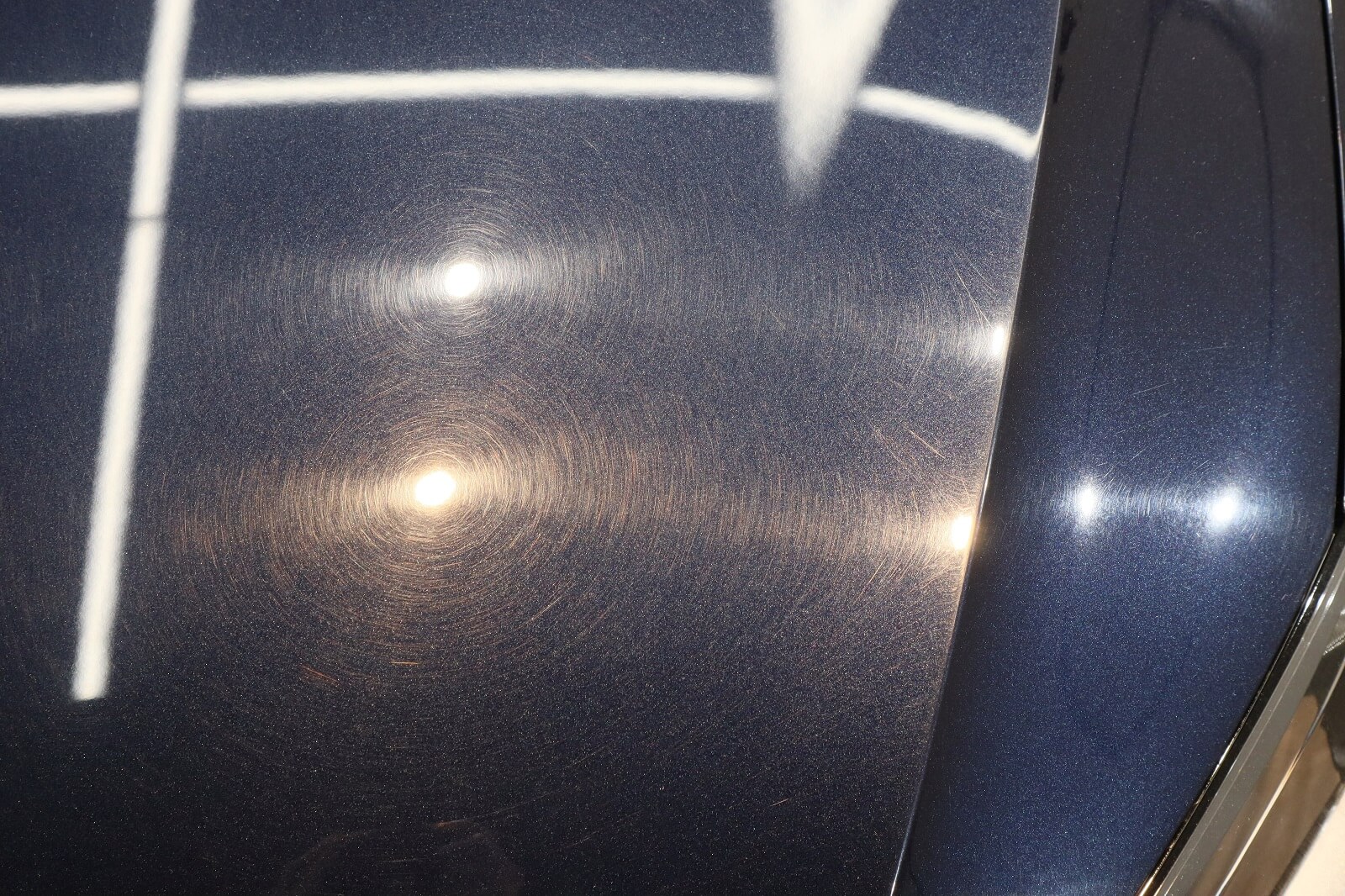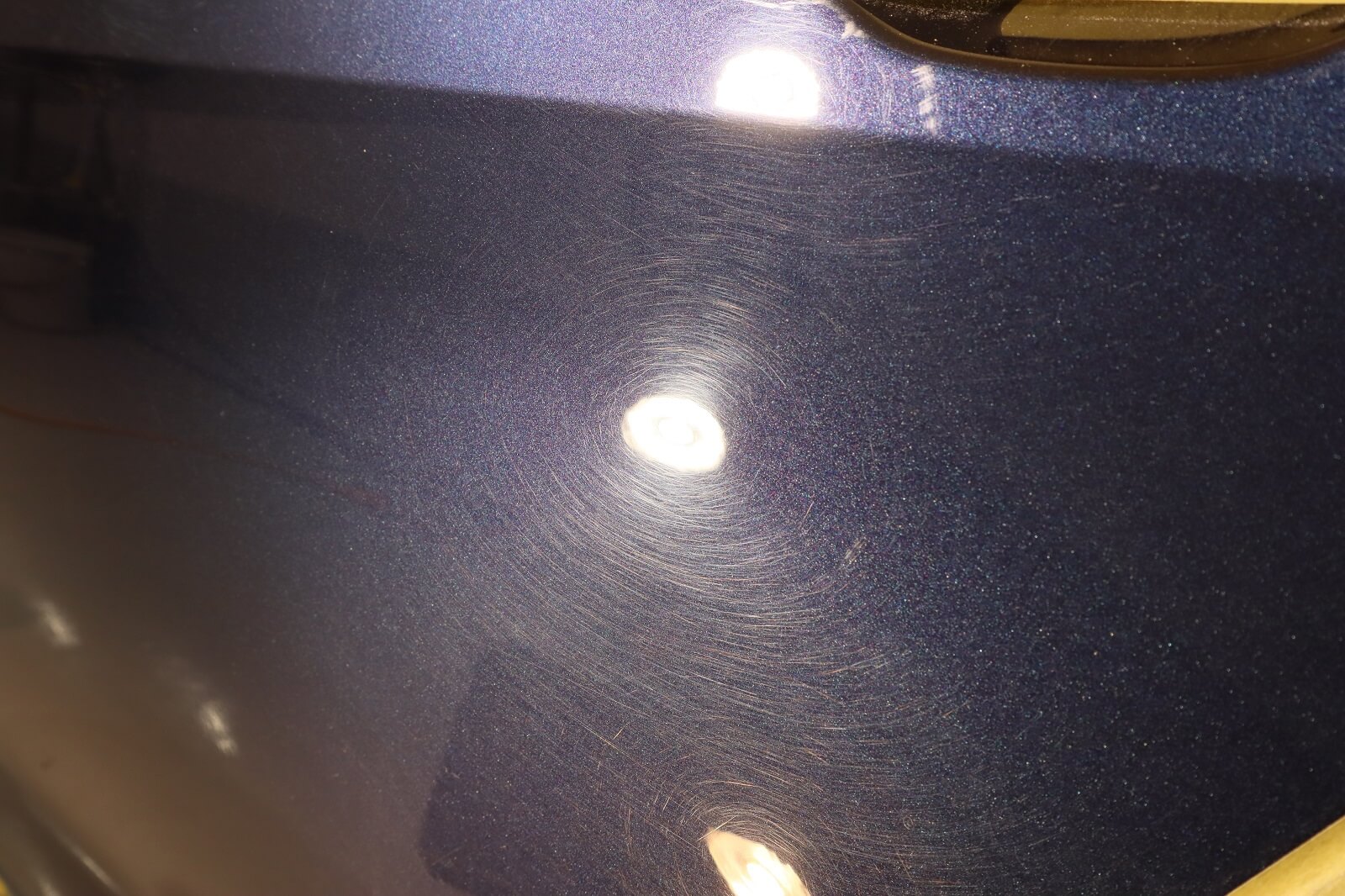 入庫時の写真です。天井の照明がくすんでぼやけて写っており、グルグルの洗車キズがハッキリと見える状態です。これでは本来の色はもちろん、ボディ全体が白くなってしまいます。