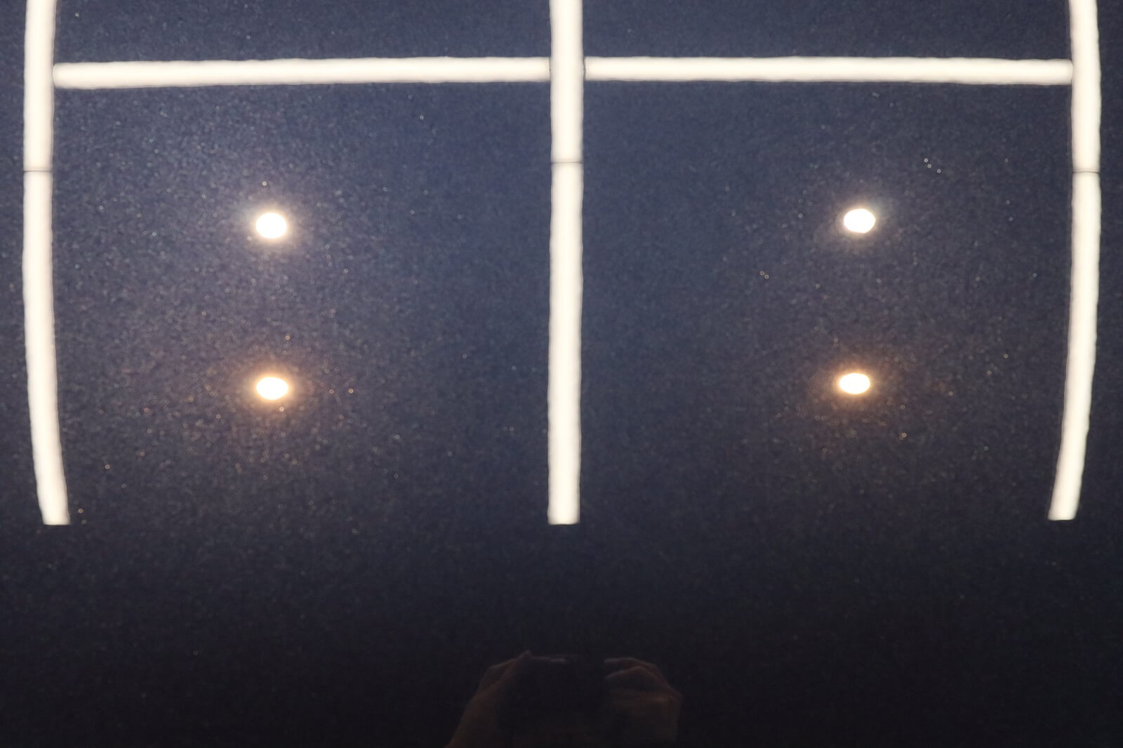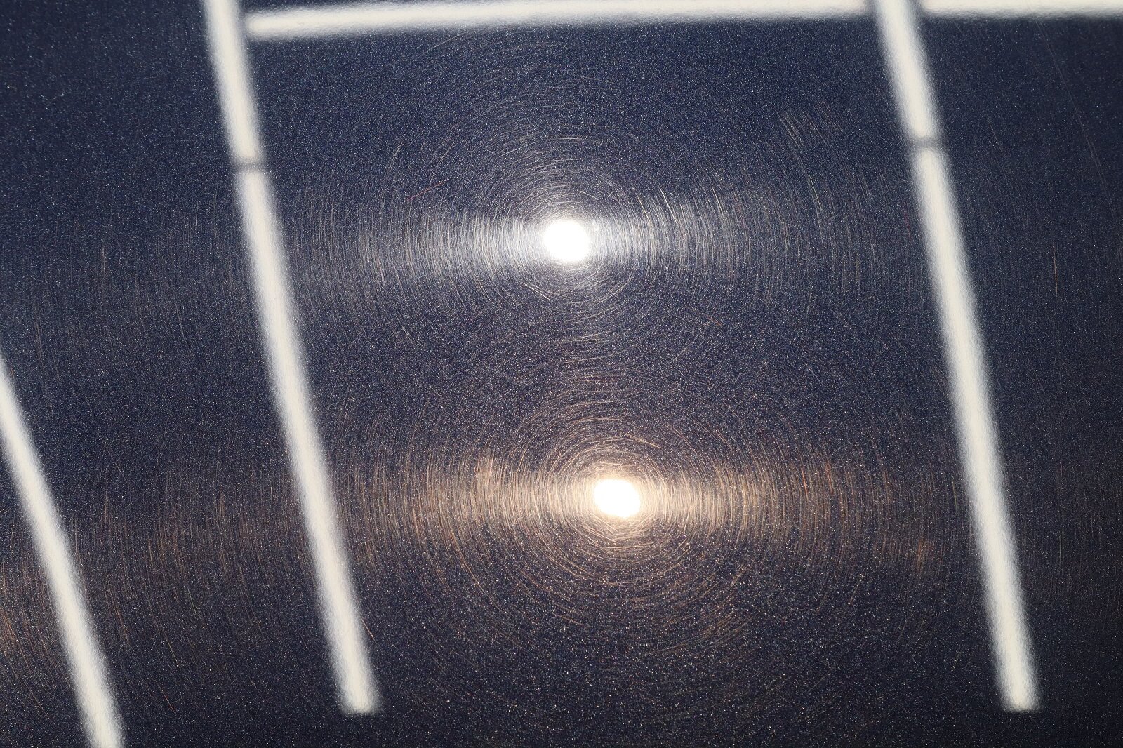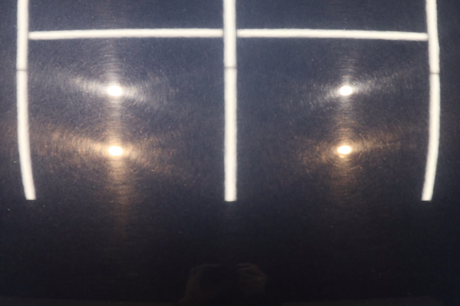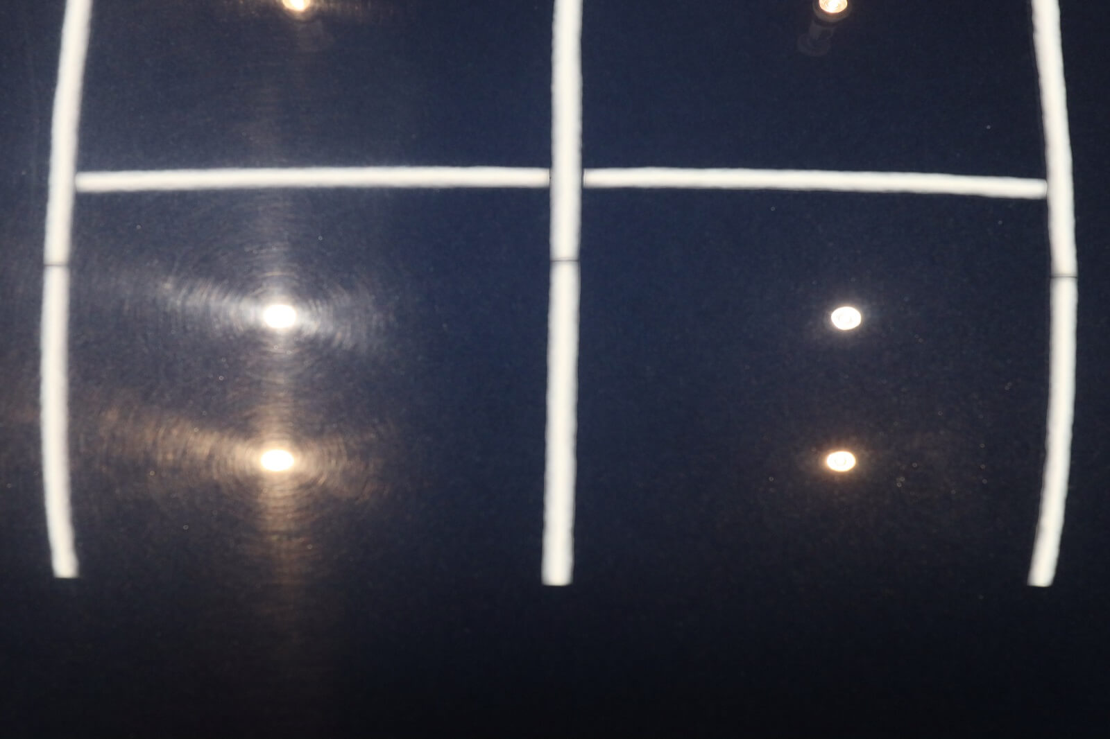初期研磨を行った状態です。キズが取れて天井のライトがくっきり見えるようになりました。この様にどんどん研磨していきます。