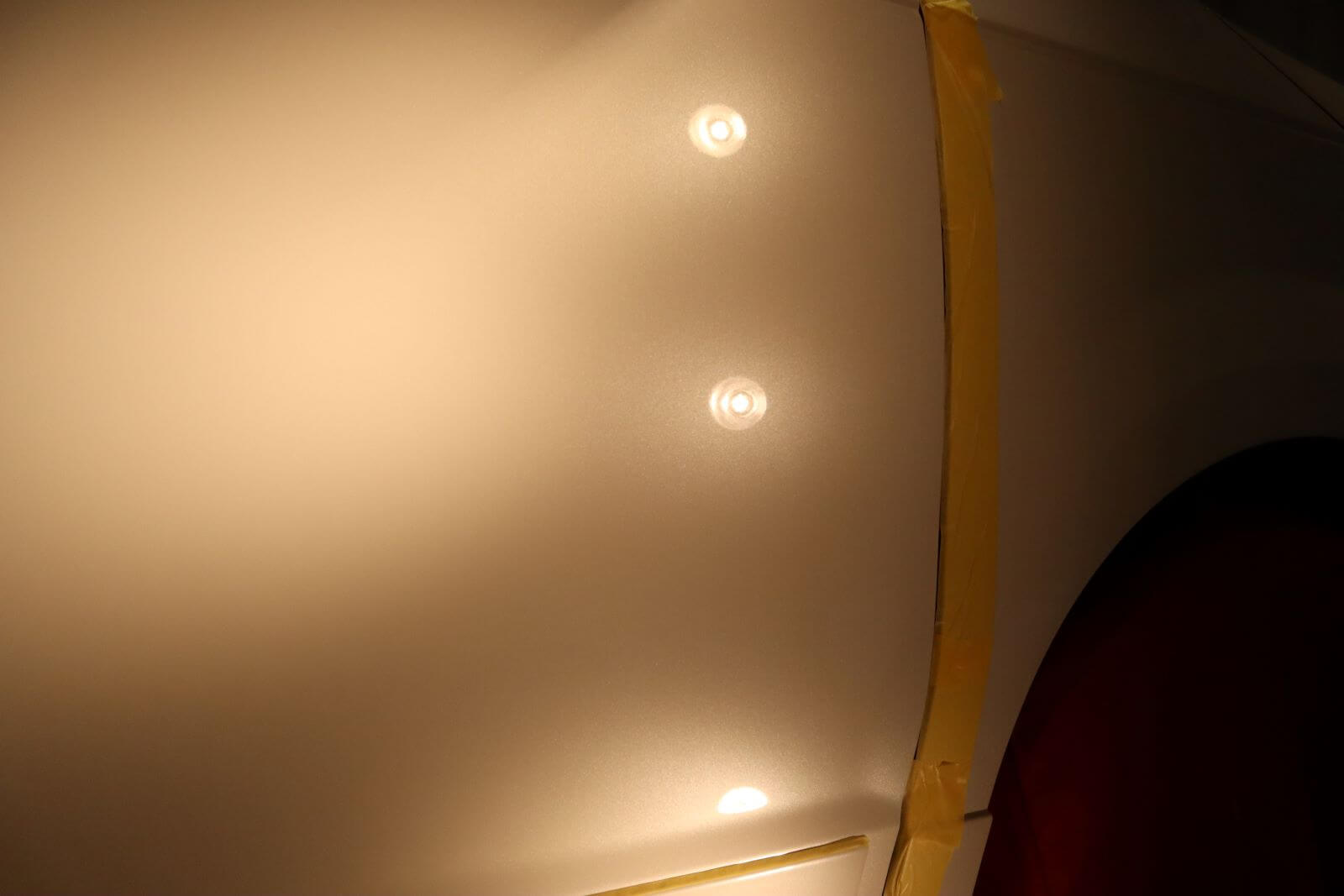 ドアの研磨です。ライトの写りがはモヤモヤしているのが分かると思います。研磨することで塗装面を最大限に美しくします。