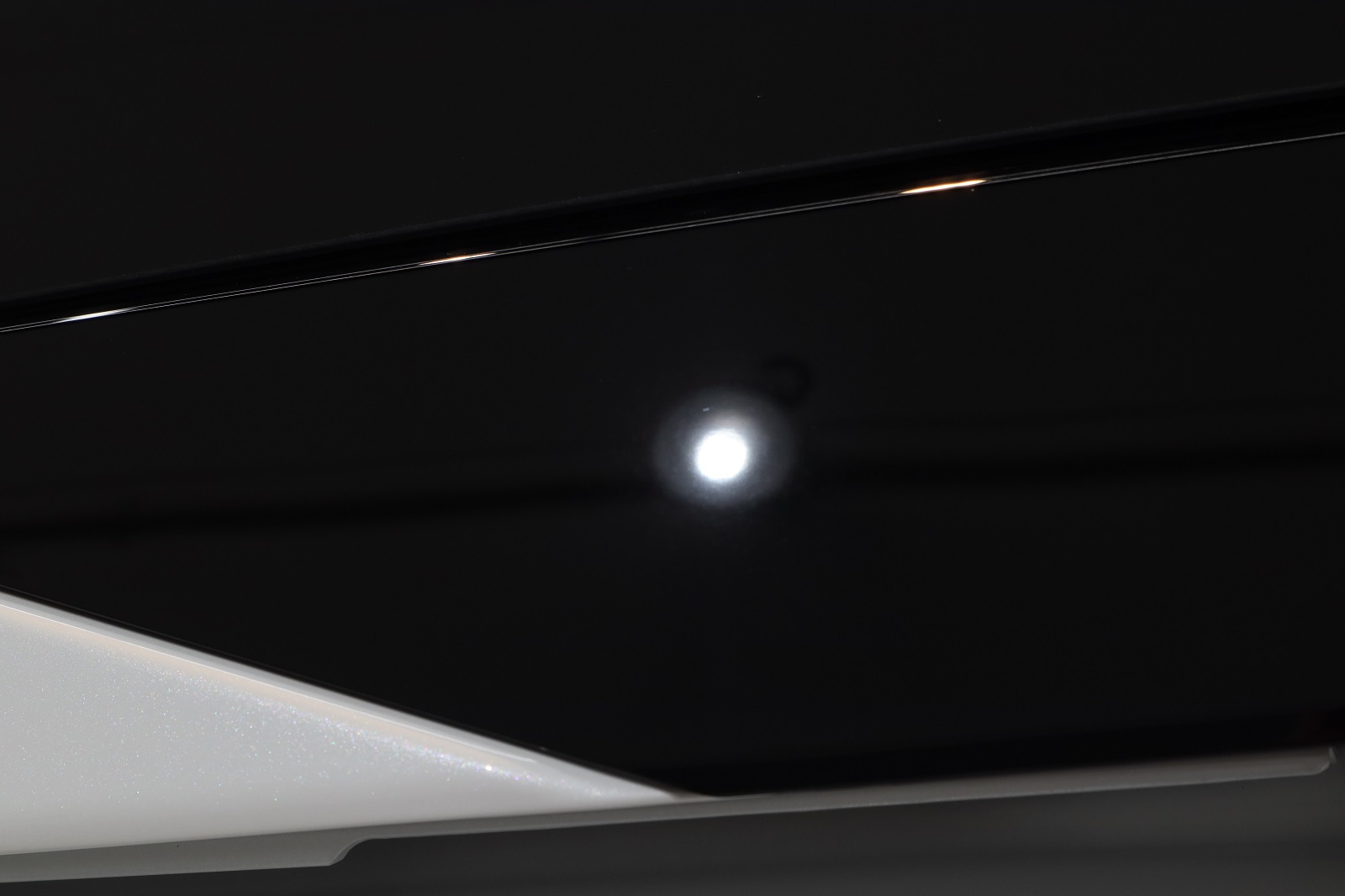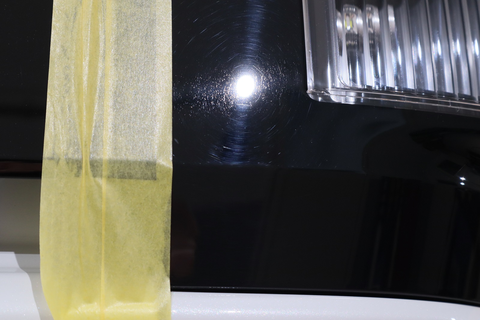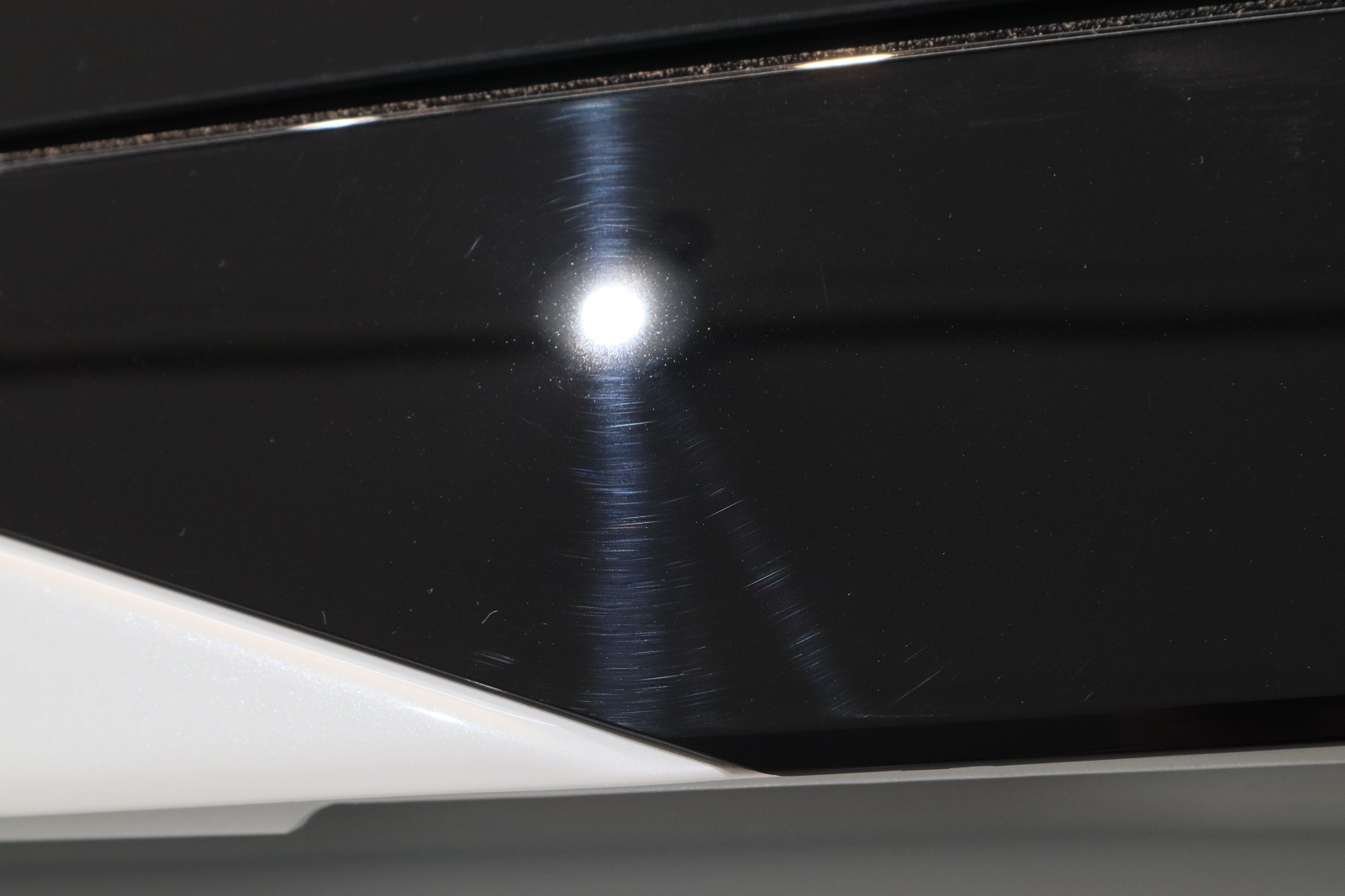 こちらも左リヤフェンダーのピアノブラック部です。やはりグルグルキズが入っておりますね。こちらも研磨で除去して行きましょう。