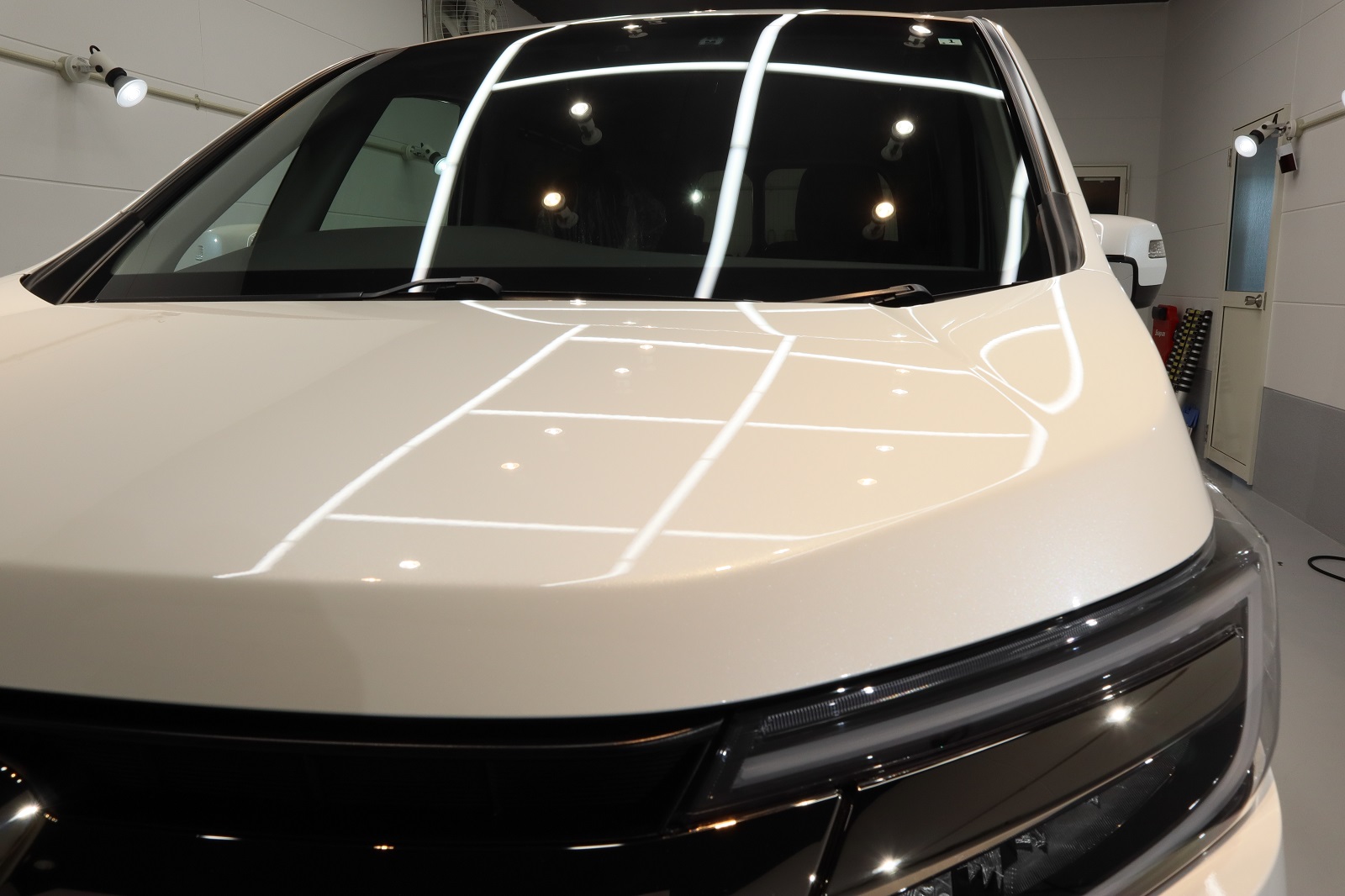 研磨中のボンネットです。照明がクッキリ見えますが