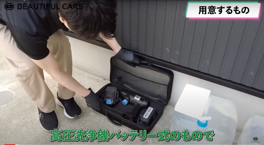 ①純水をボディにかけるためのバッテリー式の高圧洗浄機またはマルチクリーナー(ケルヒャーOC3など)