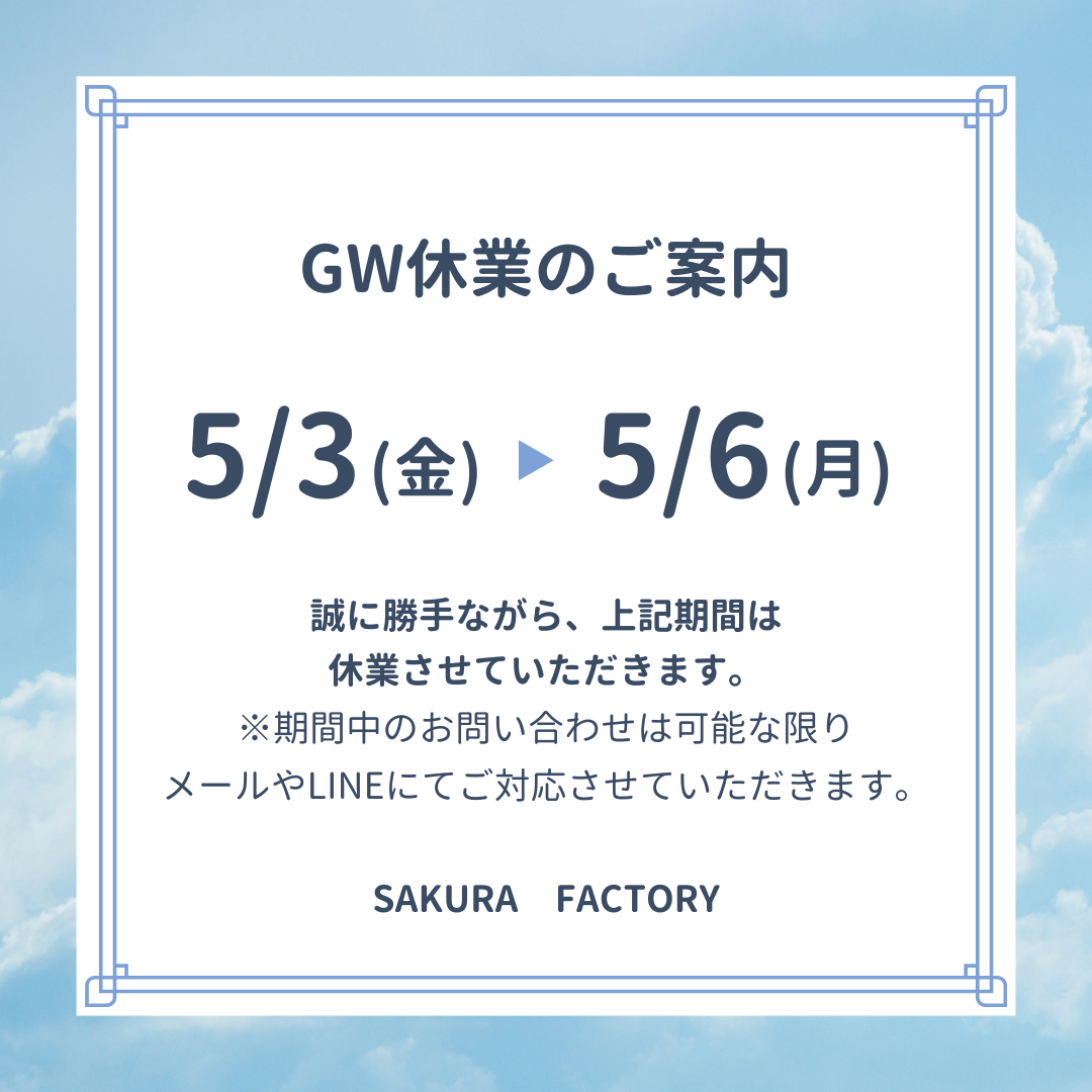 【青森・弘前】ゴールデンウィーク休業のご案内 平素は格別のお引き立てを賜り厚く御礼申し上げます。 誠に勝手ながら、 以下の期間を休業とさせていただきます。 ゴールデンウィーク休暇期間05月03日(金)~05月06日(月) ※休業期間中にお問い合わせいただきました件に関しては、可能な限り期間中もご返信させていただきます。 ご迷惑をお掛けいたしますが、 何卒ご了承くださいますよう宜しくお願い申し上げます。 2024年04月22日