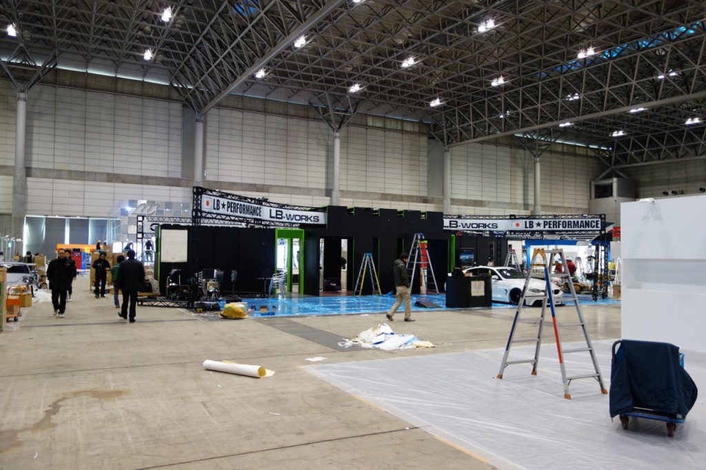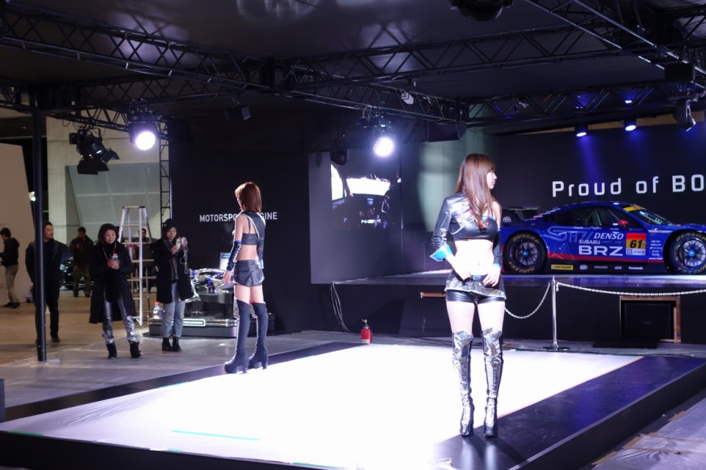 作業も終わり、深夜の会場内を少し歩いてみました。スバルSTIブースではリハーサル中。朝まで作業した方も沢山いらっしゃったようです。