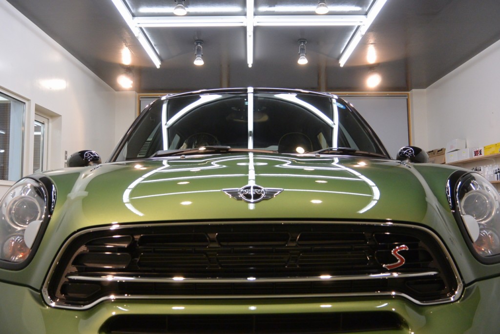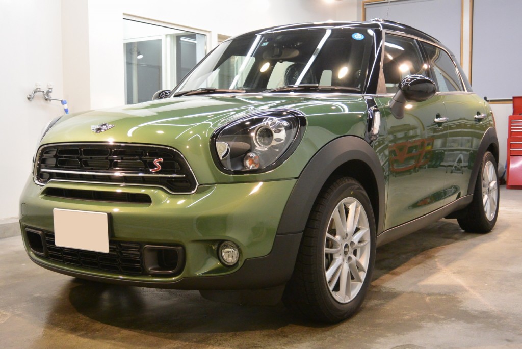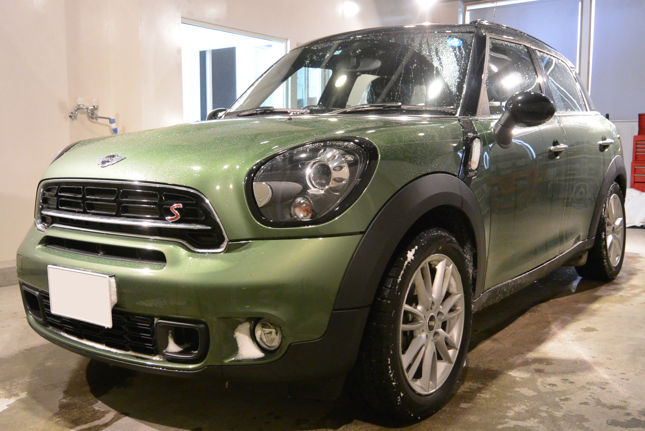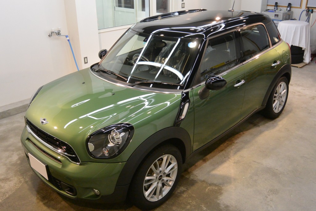 ミニ クロスオーバー、軽研磨+グロスアーマー+金属モールコート+全面ガラス撥水コーティング+夏用ホイールコーティングのご用命でご入庫いただきました。