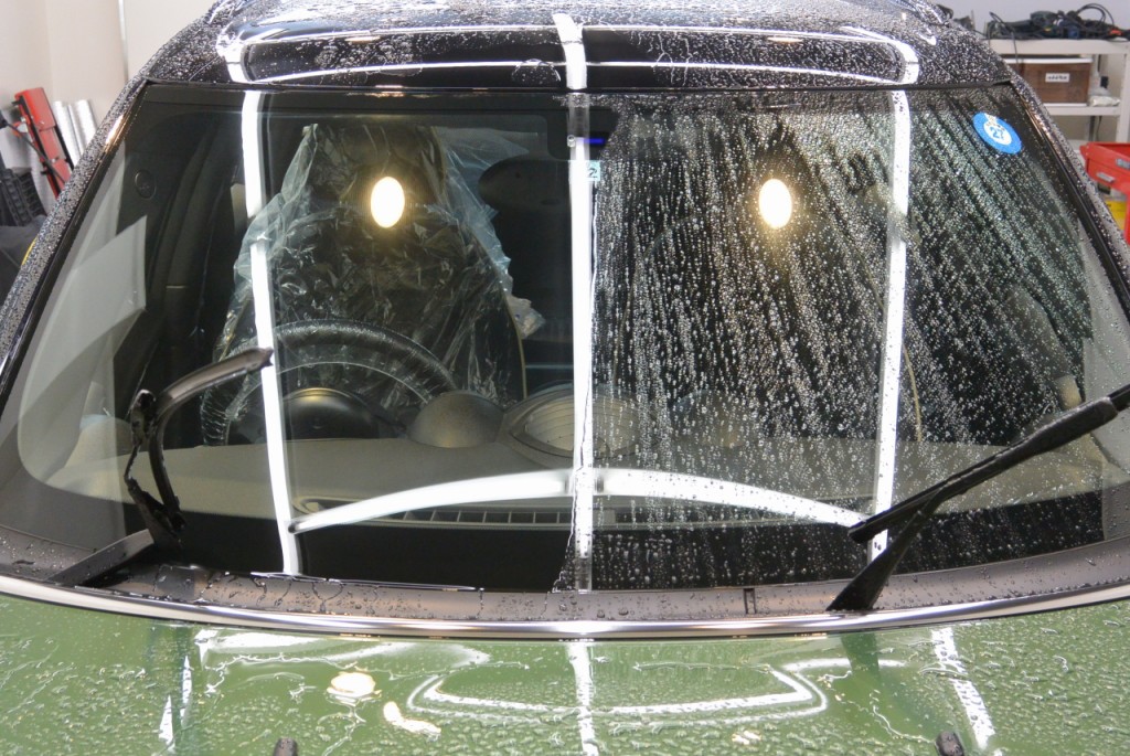 左側が下地処理が完了した状態。付着物の無くなったガラスは、水を全く弾かなくなります。この後、ガラスの撥水コーティングを施工いたします。