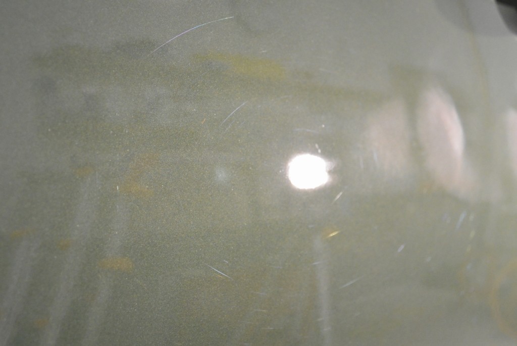 まずは徹底的な洗浄を行います。写真でお分かりになるように、ルーフの傷が非常に目立ちます。新車はメーカーから送られてくる際に保護フィルムが貼られております。ディーラーではがして納車するのですが、糊跡を取る為にゴシゴシ擦ったのでしょう。傷を付けた上に、糊は残っています。何百万円もする高価な商品を、傷だらけにして納車する…。私には全く理解できませんが、これが普通だという事実。何とかしたいです。これらの糊跡は当店で専用の洗剤を使って優しく除去いたしました。