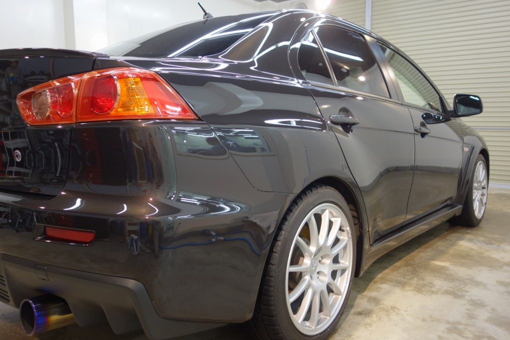 熱を加え、叩いて鉄を鍛える。その時赤く熱せられた鉄が冷めていく時の色をイメージしたという「ファントムブラック」。新車から7年を経過して、新車以上の光沢を放っております。今年いっぱいで製造中止が決まったランサーエボリューションです。これからも美しい愛車をお楽しみいただければ幸いです。