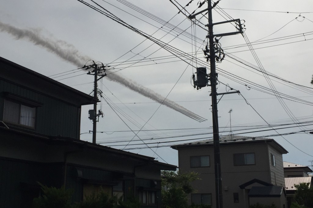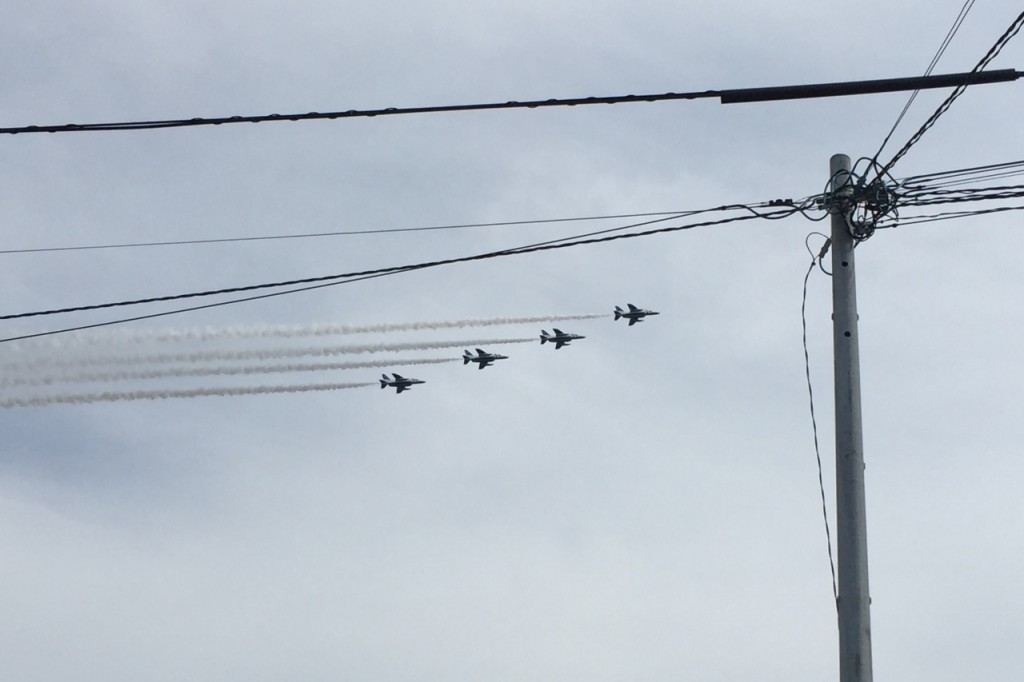 本日明日と、当店のある秋田県秋田市では東日本大震災からの復興を祈願し始まった東北六魂祭www.rokkon.jpが開催されております。通常営業の当店は、本日も魂を込めて、お客様の大切な愛車を綺麗にさせていただいておりました。そんな当店の前を、会場にて演技中のブルーインパルスが何度か通過しました。