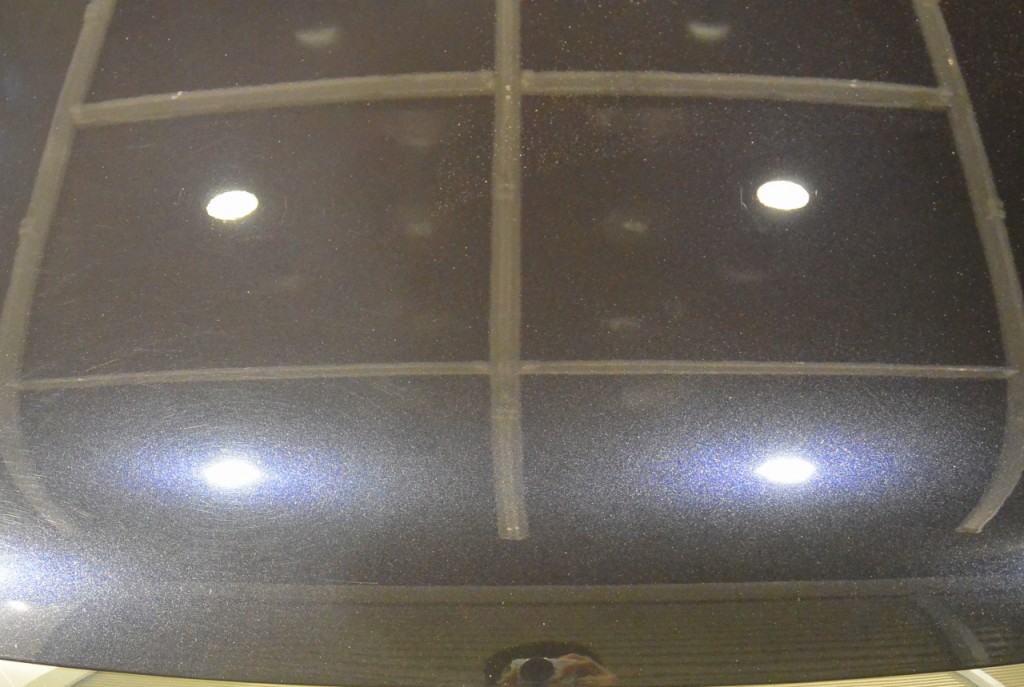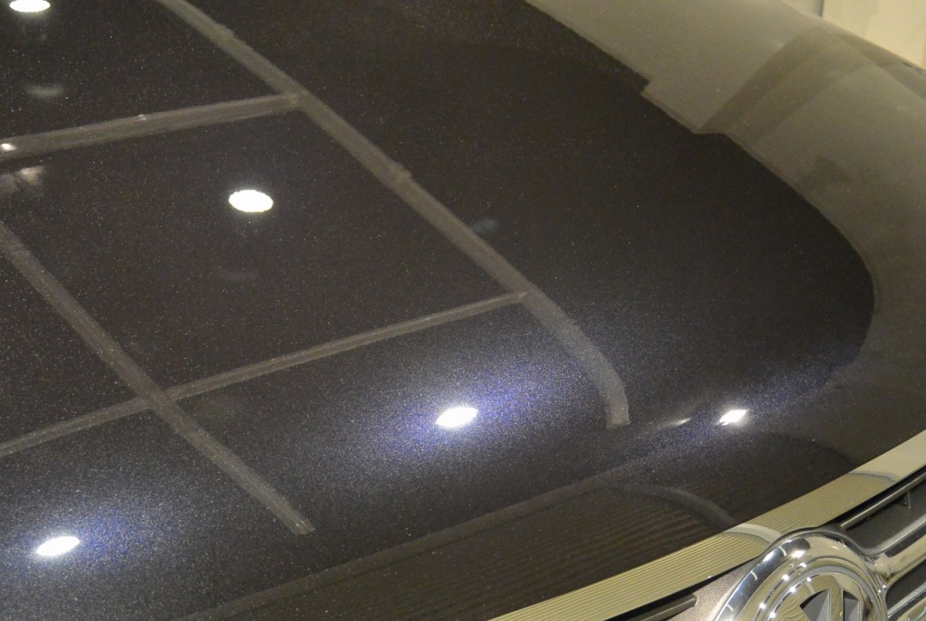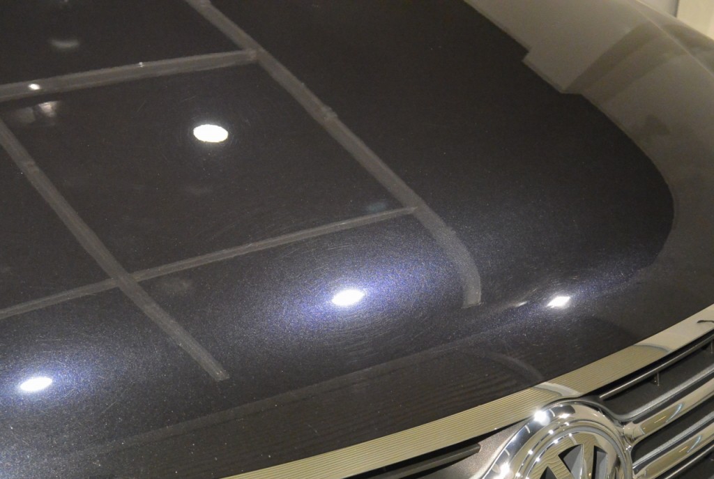 徹底的な洗車の後、クリア樹脂を補充いたします。ボンネットにうっすらと見える洗車傷。