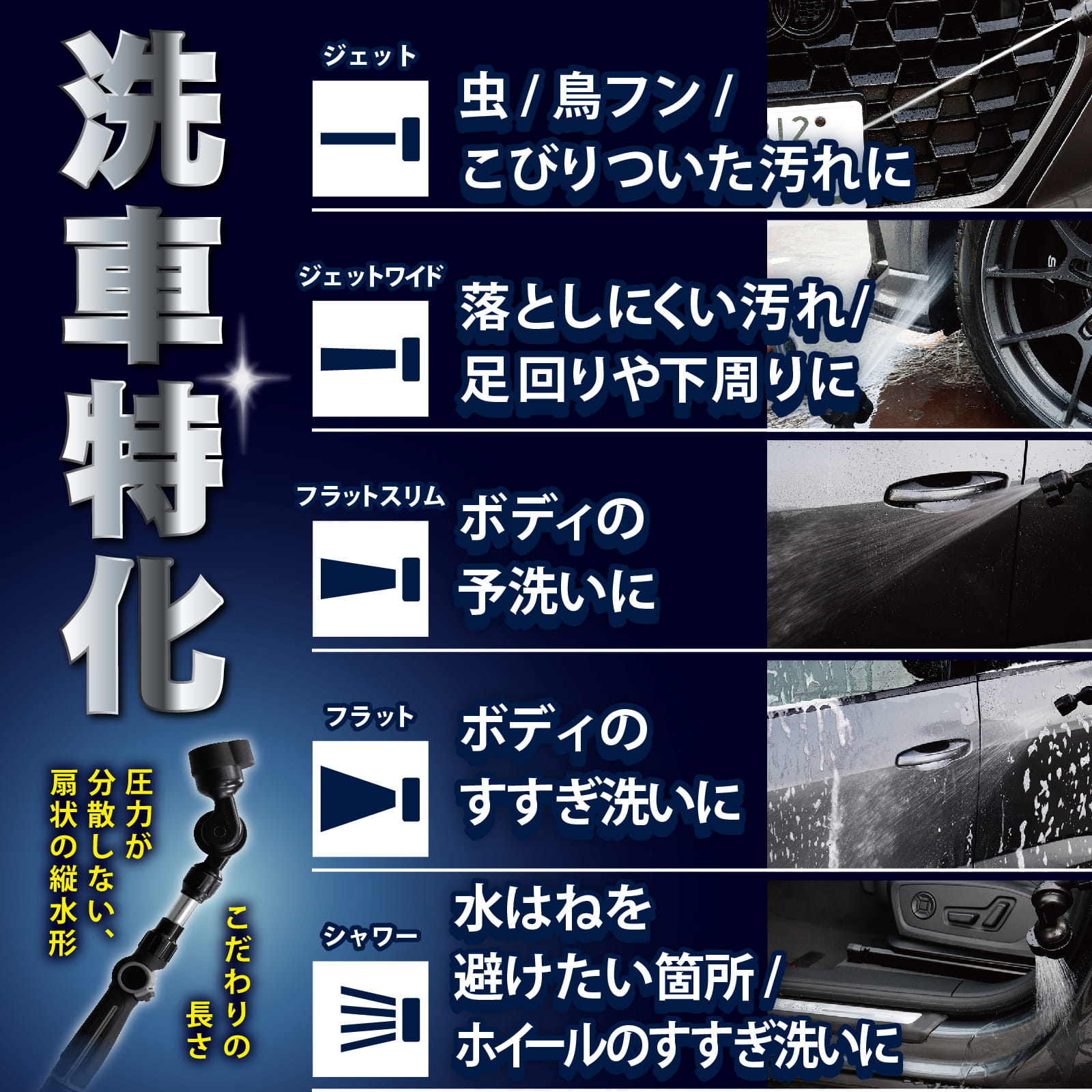 付属のノズルは、車のあらゆる箇所の洗浄に特化した、こだわりの5水形。虫や鳥フン等こびりついた汚れに適した「ジェット」、足回りや下周りに適した「ジェットワイド」、ボディの予洗いに適した「フラットスリム」、ボディのすすぎ洗いに適した「フラット」、水はねを避けたい箇所やホイールのすすぎ洗いに適した「シャワー」の水形をノズル先端を回すだけで切り替え可能。洗車に特化した、こだわりの縦水形です。